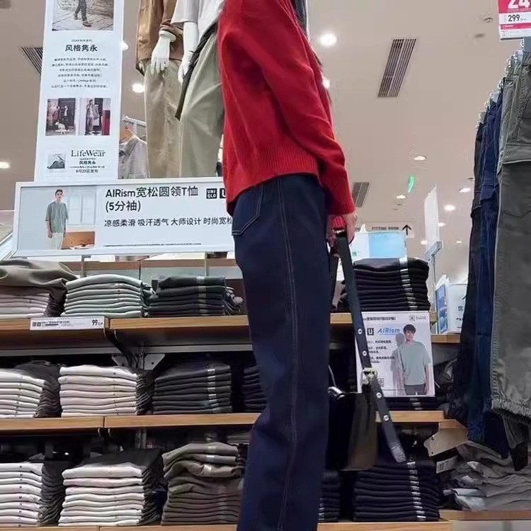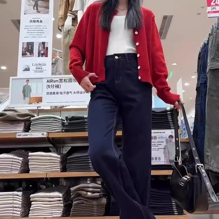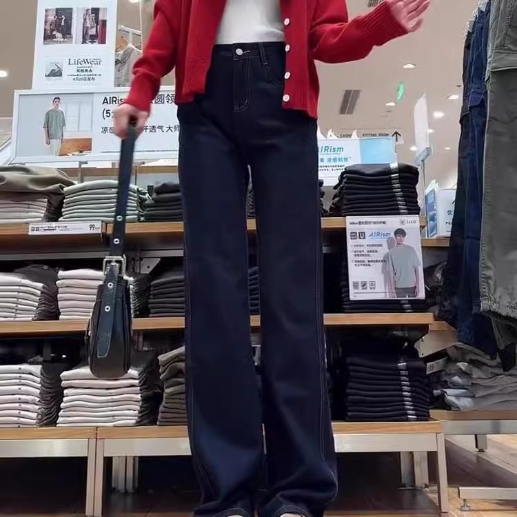 丹宁深蓝色窄版阔腿牛仔裤女2025年春秋新款夏季薄款直筒拖地裤子