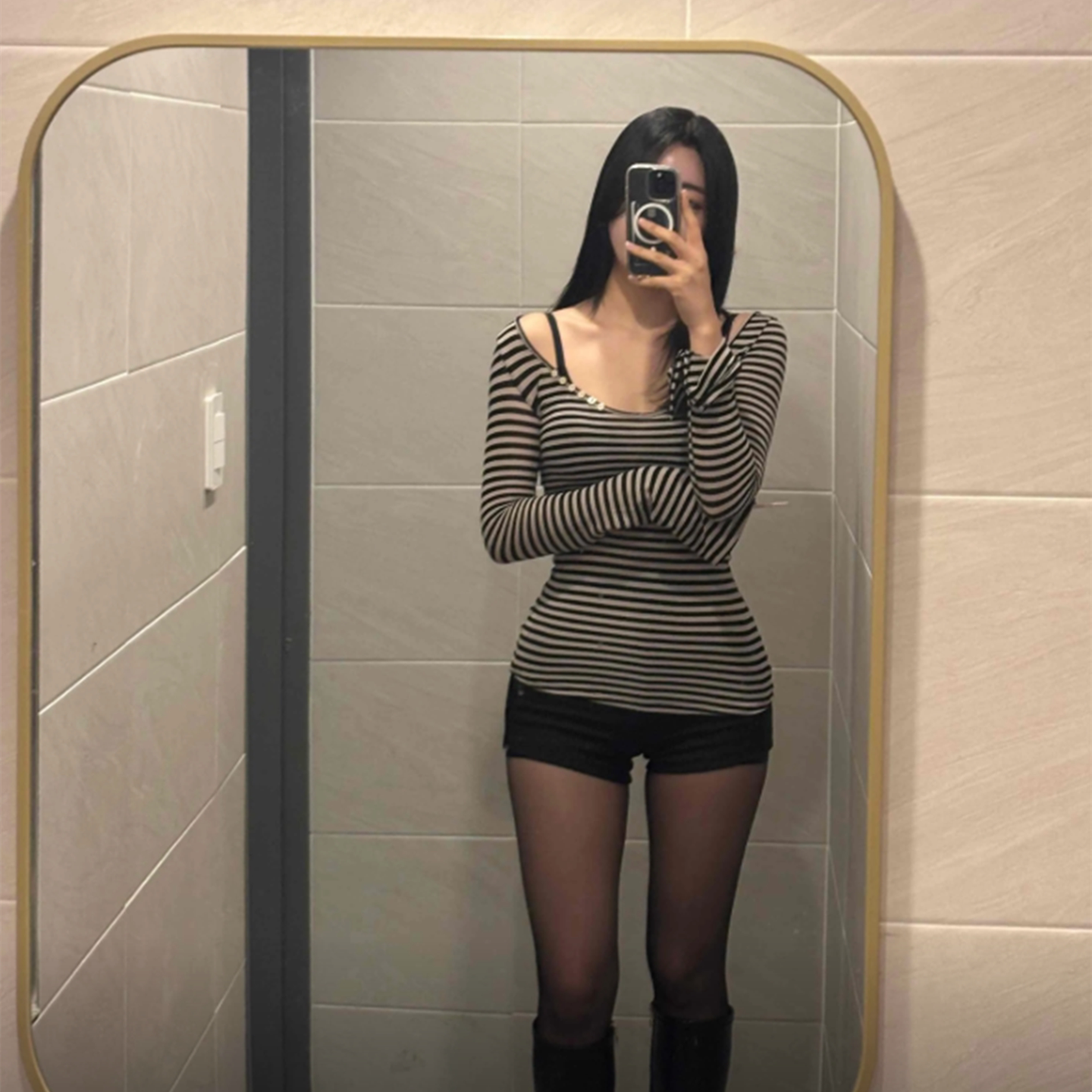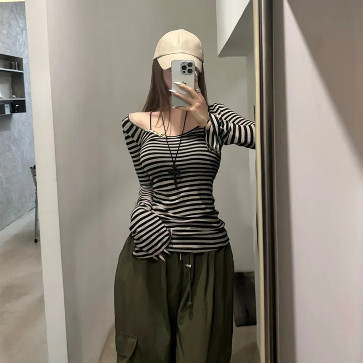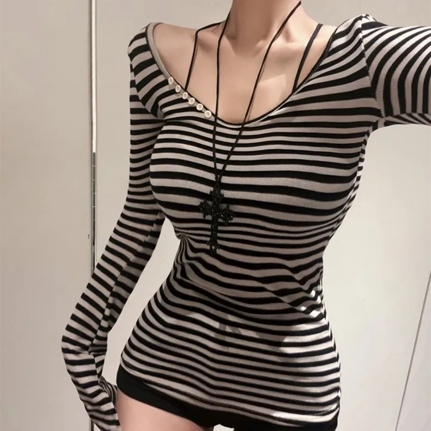 shemoda条纹印花纽扣U领长袖T恤女 早秋季百搭中长款修身显瘦上衣