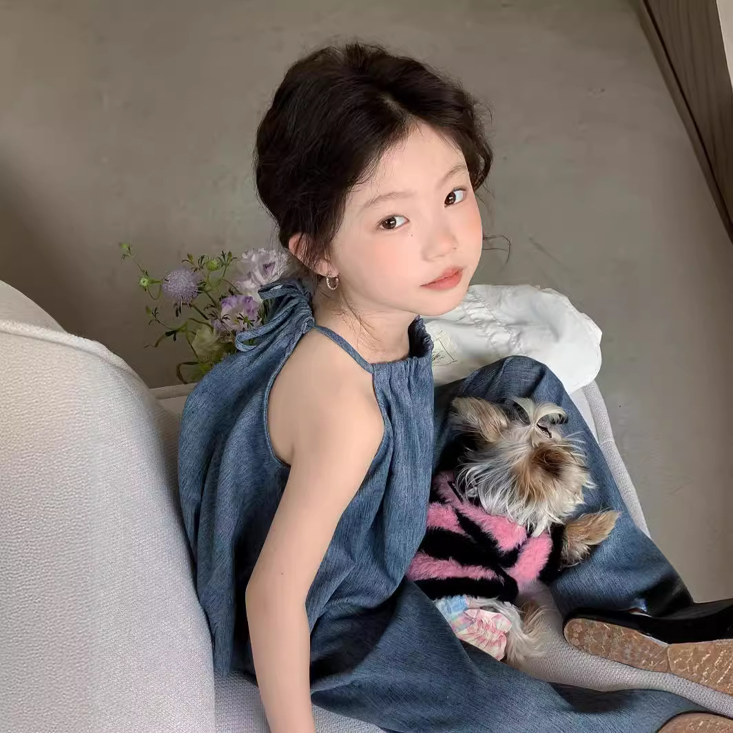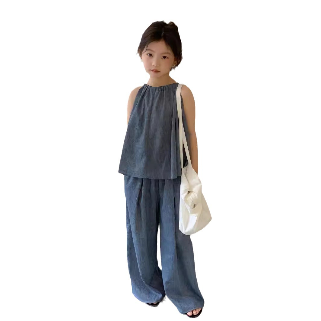 韩国童装2025夏款女童蓝色吊带阔腿裤套装中大童女宝清凉两件套