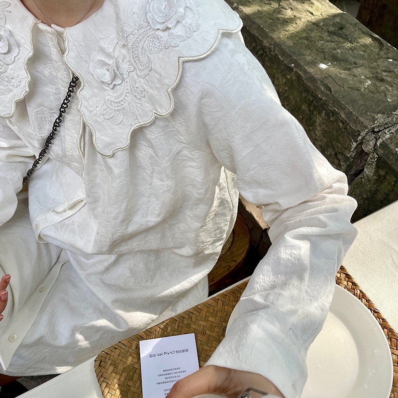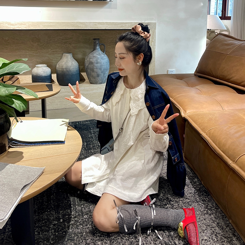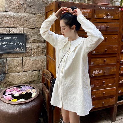 heidy海蒂 精致小白花 棉麻提花刺绣宽松娃娃领衬衫裙长袖连衣裙