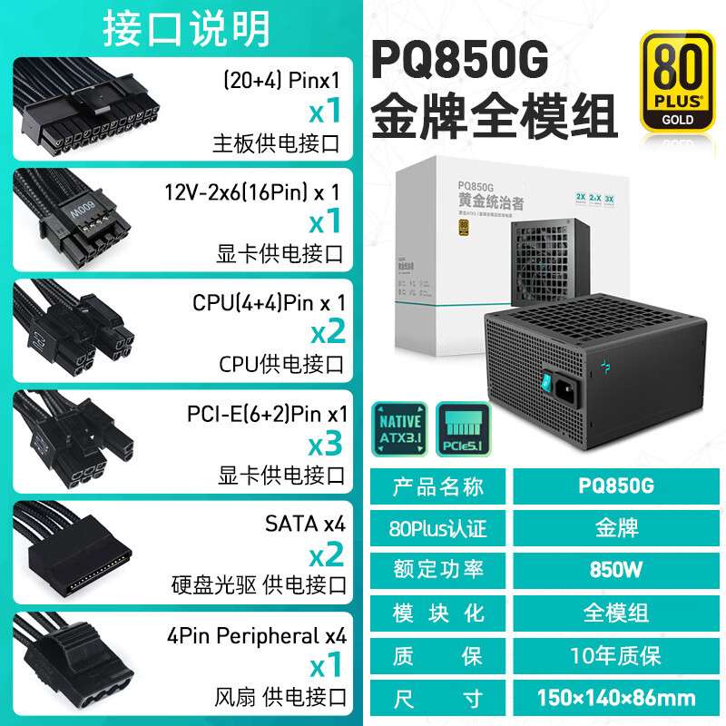 九州风神PQ850G金牌全模电源原生ATX3.1接口日系电容FDB风扇850W