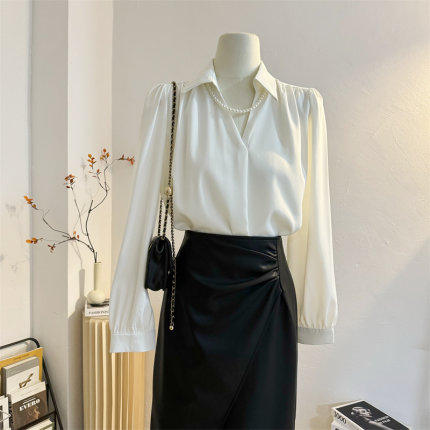 法式高级感半开V领缎面衬衫女秋珍珠链设计通勤气质醋酸长袖上衣