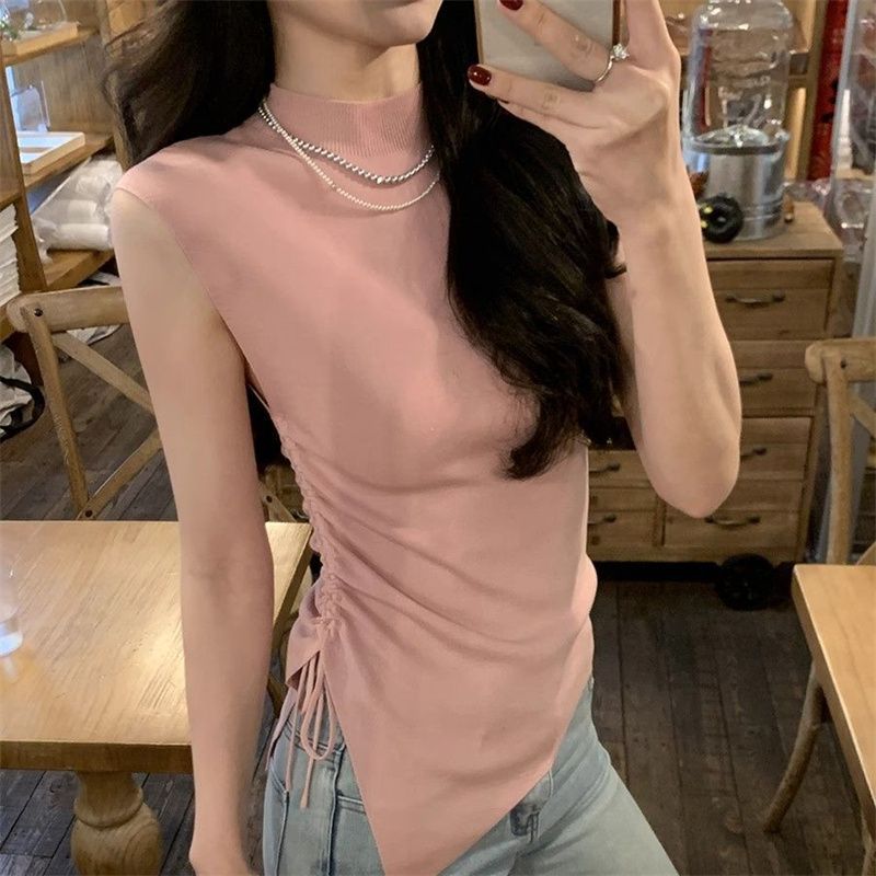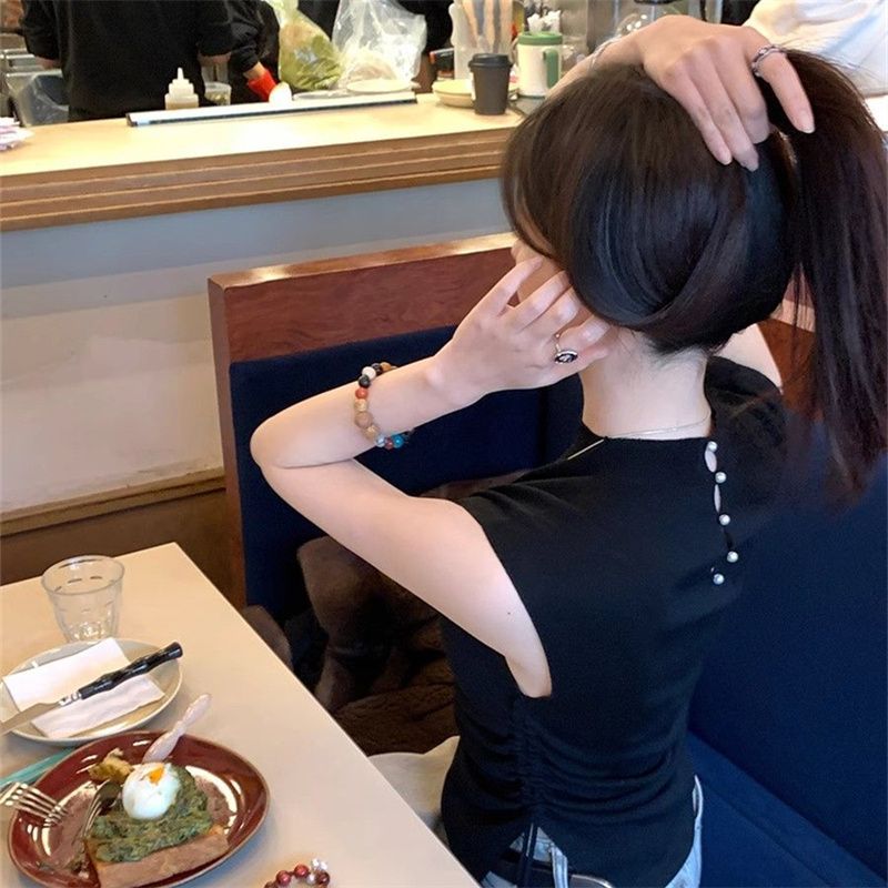 前后两穿抽褶收腰短袖t恤女夏装修身显瘦不规则短款针织衫上衣服
