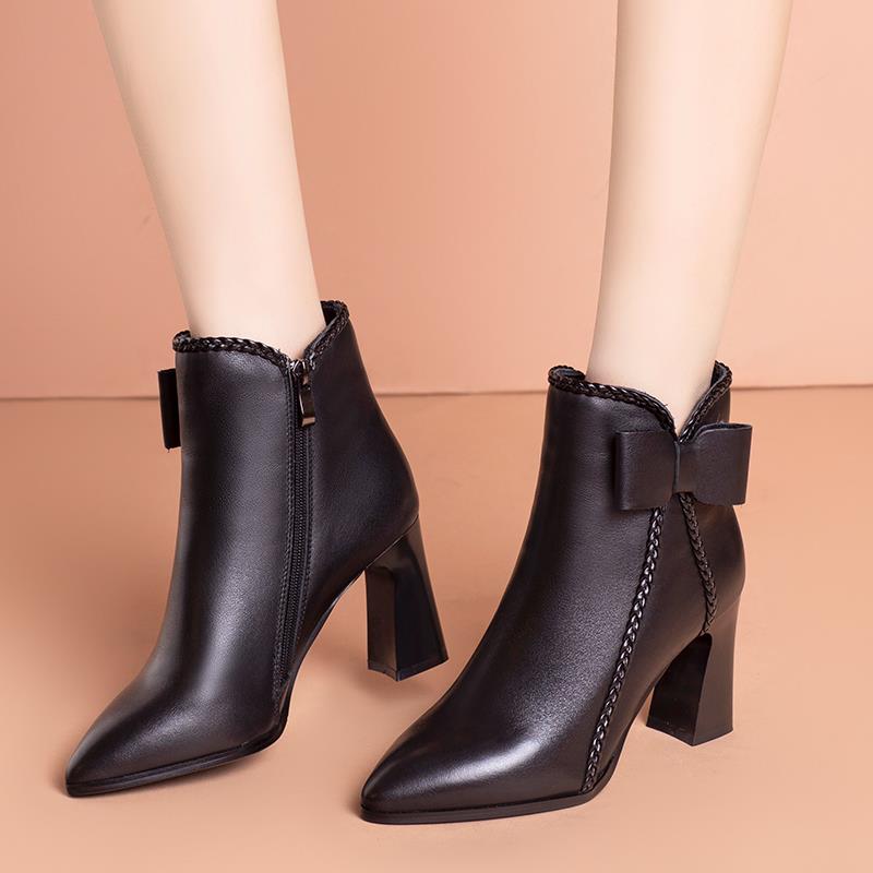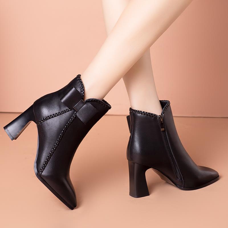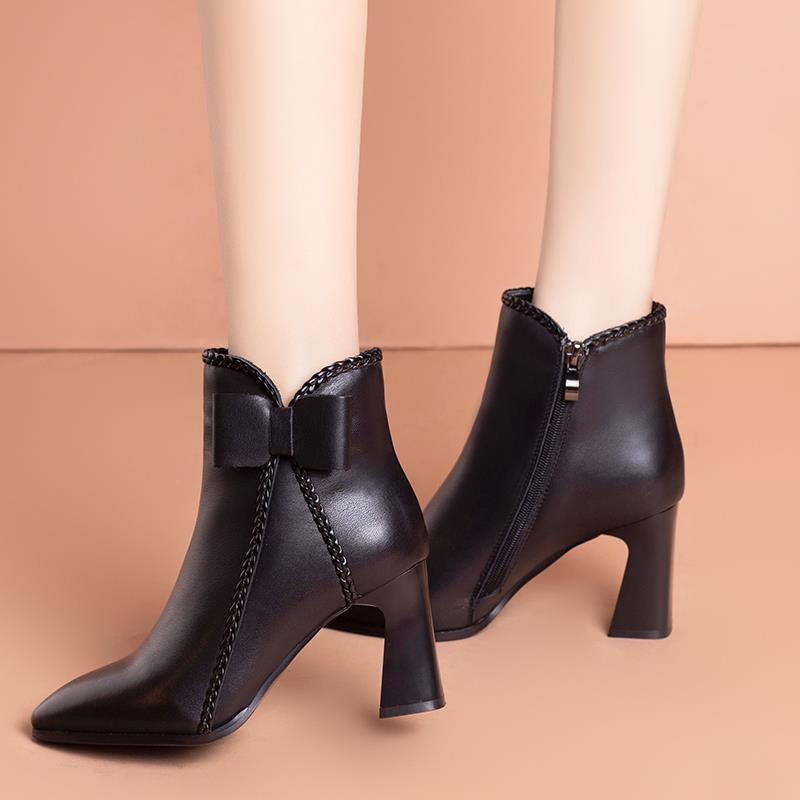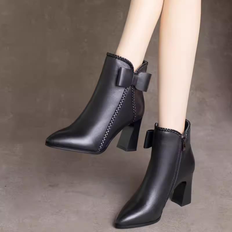 秋冬2025季新款尖头高跟短靴女粗跟皮鞋加绒鞋裸靴马丁靴1007u