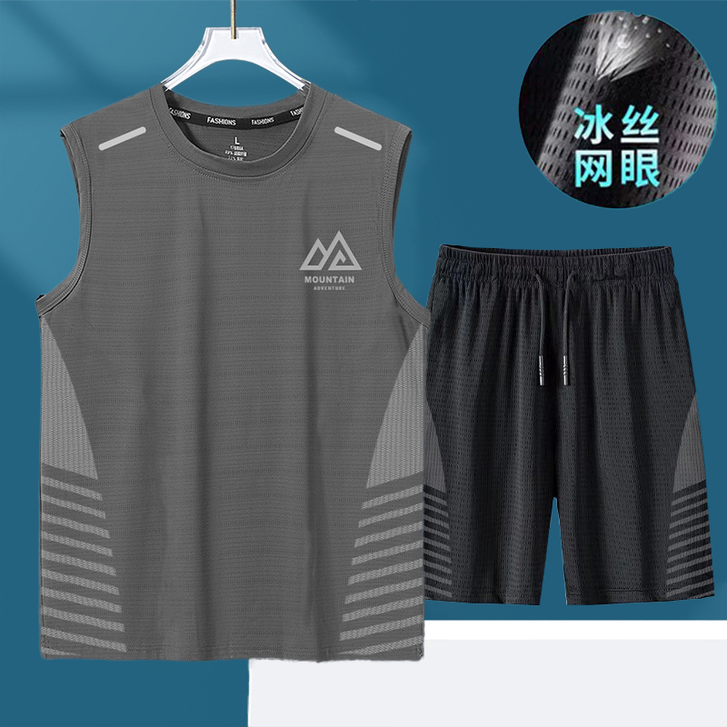 速干透气跑步运动套装男夏季冰丝无袖坎肩背心短裤新款休闲两件套