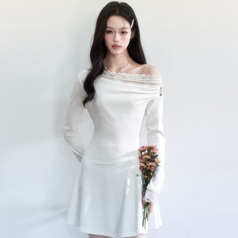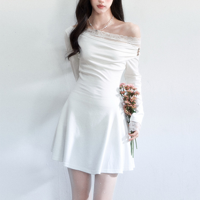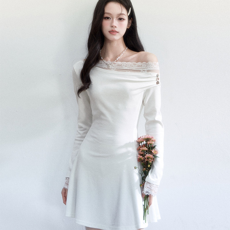 fragileheart易碎商店·月光手札早春法式斜肩蕾丝纯欲修身连衣裙