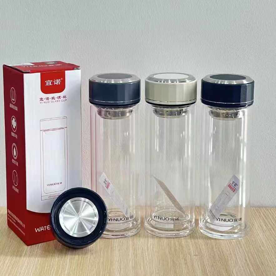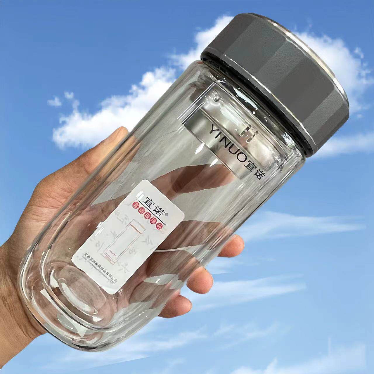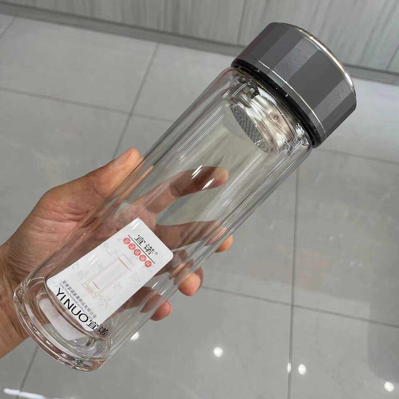 宜诺双层玻璃杯印字鹅蛋杯底水杯茶杯泡茶不锈钢盖车载定制做LOGO