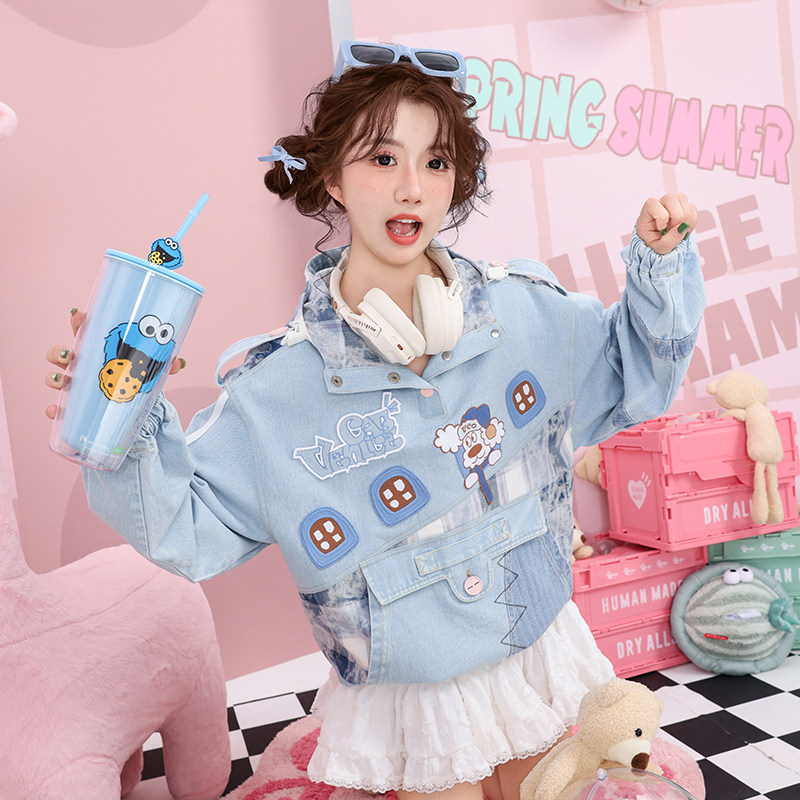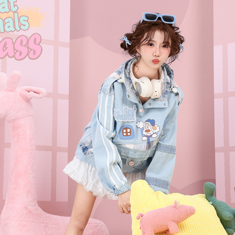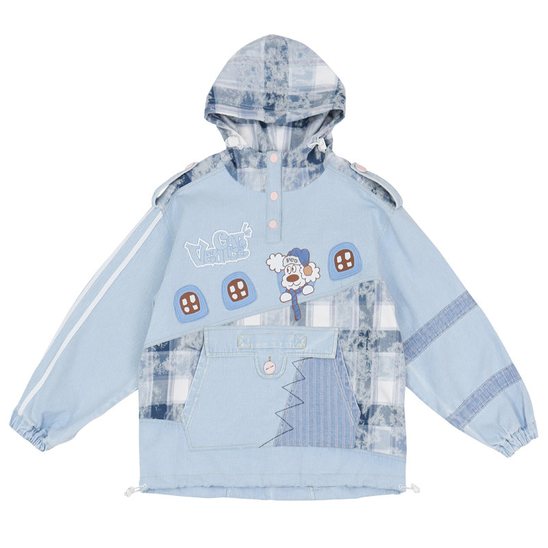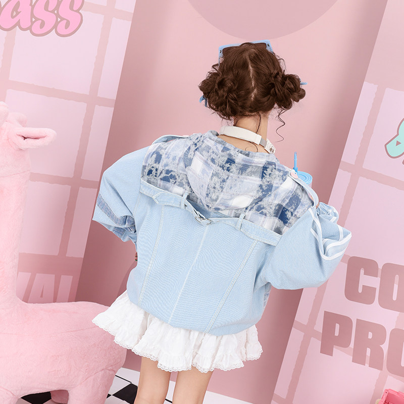 25秋装运动少女不对称上衣袋鼠兜格子拼接宽松慵懒连帽牛仔外套