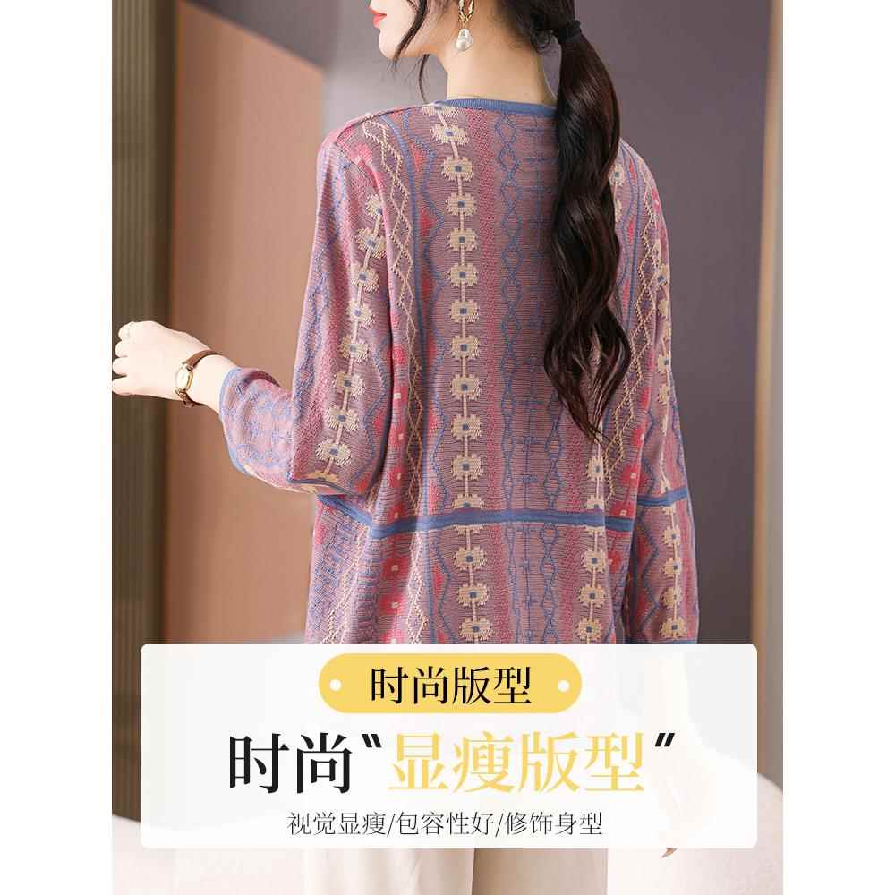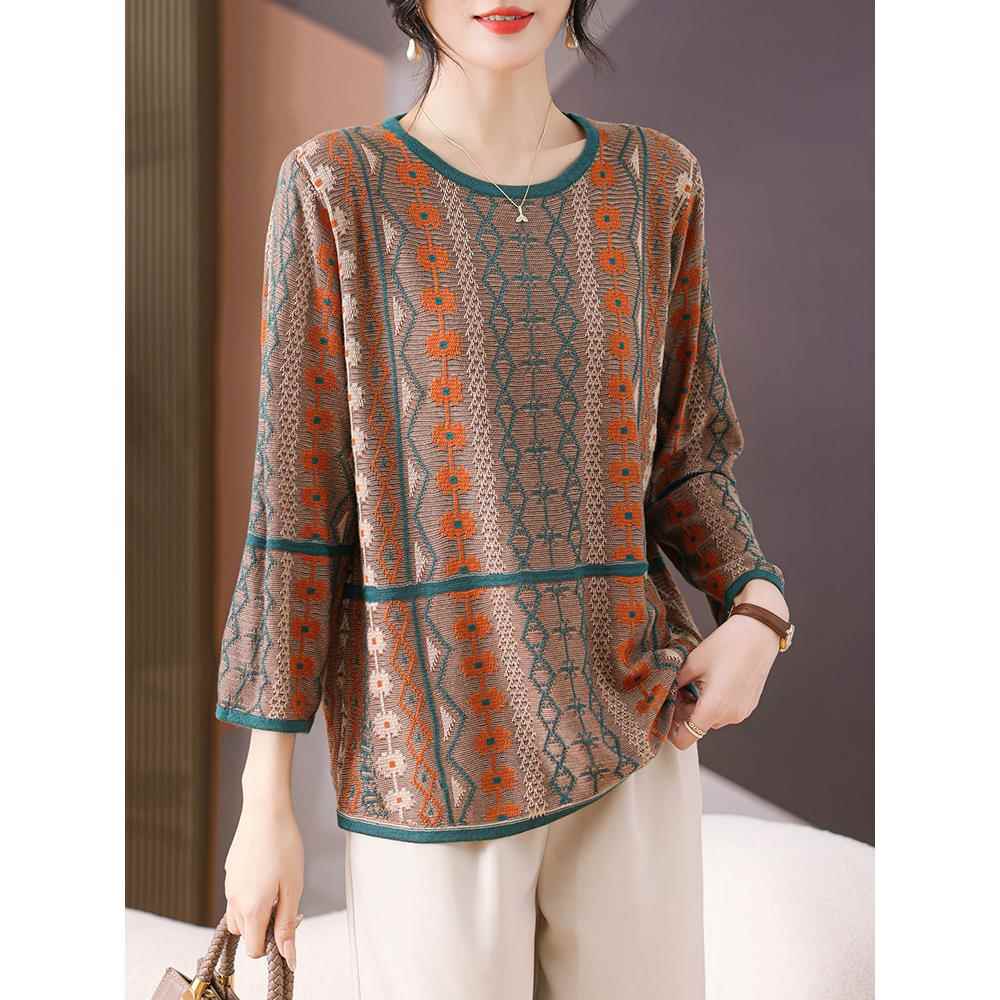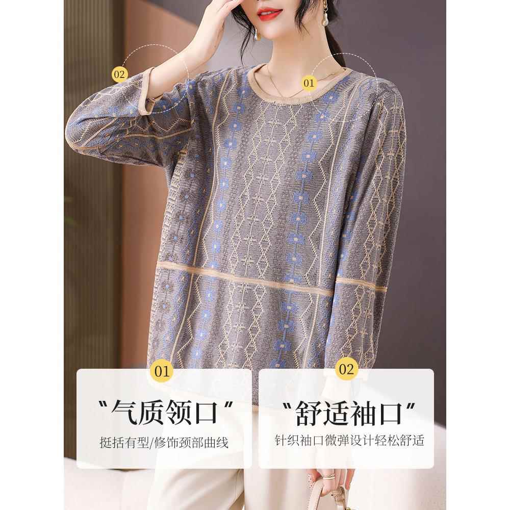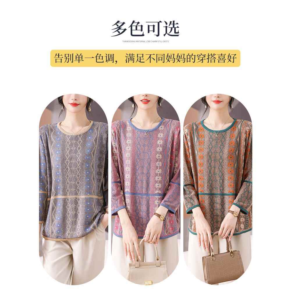 妈妈春装新款时尚圆领七分袖t恤中老年女装大码针织上衣2025薄款
