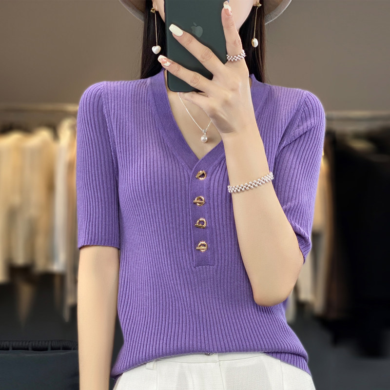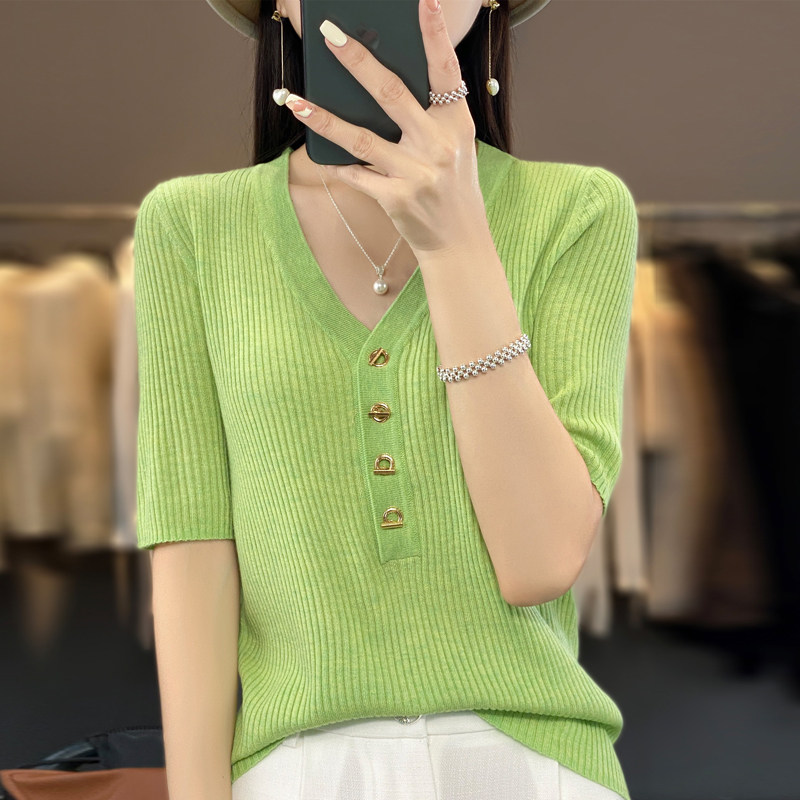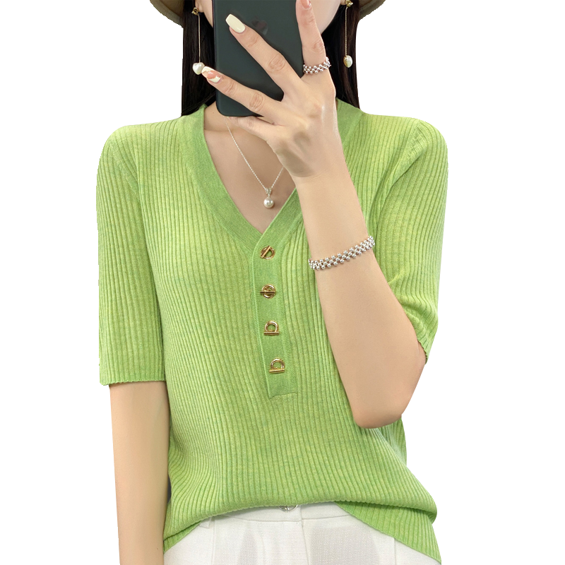 春夏新款V领抽条套头洋气针织短袖T恤女薄款纯色五分袖打底衫上衣