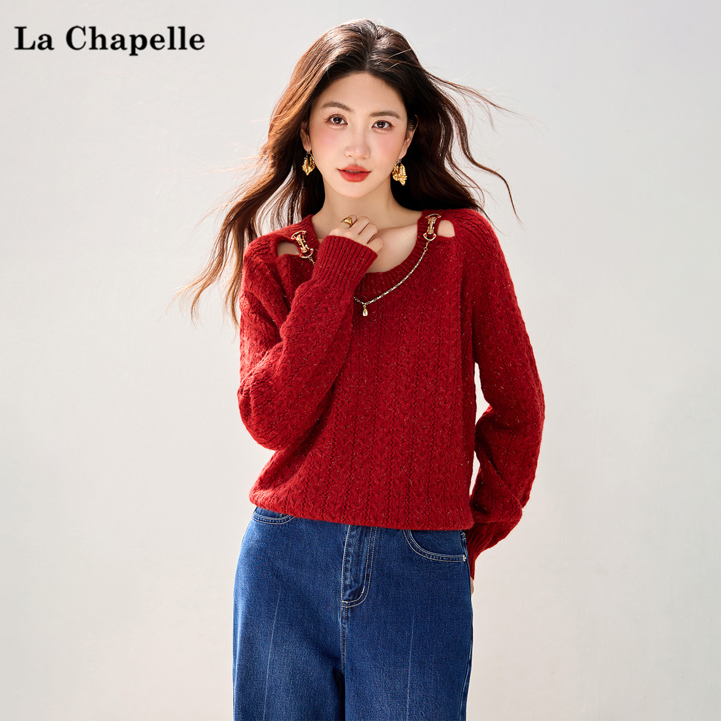 拉夏贝尔/La Chapelle圆领麻花百搭针织衫宽松套头纯色气质上衣女