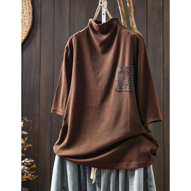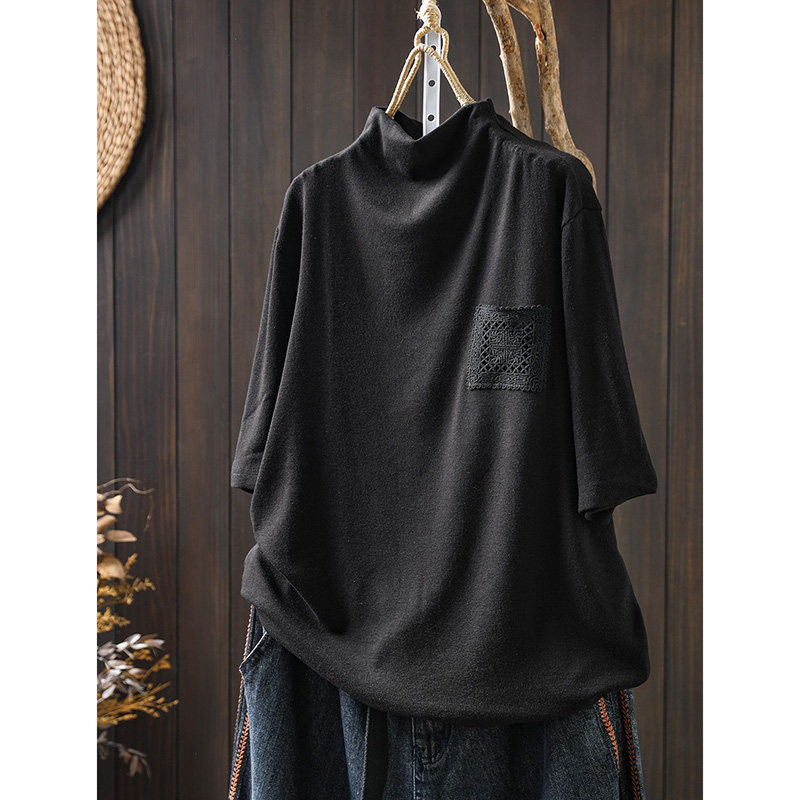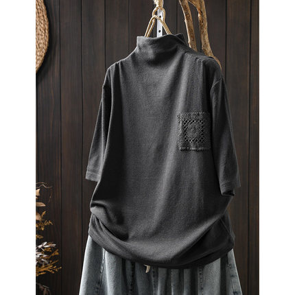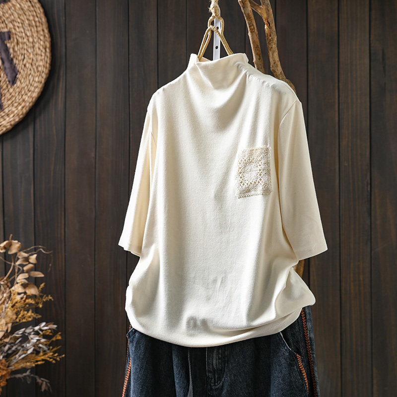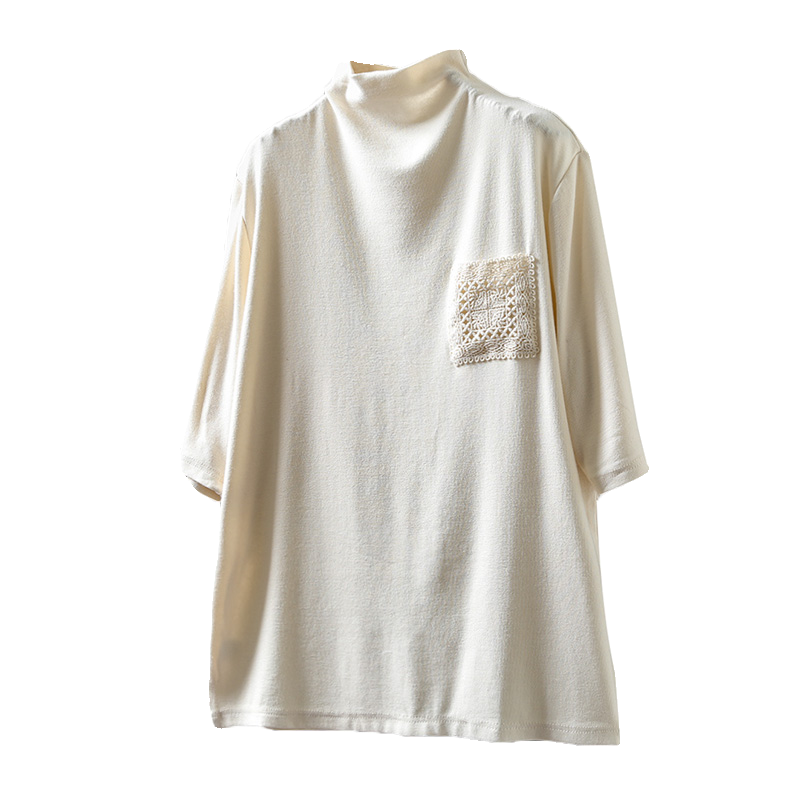 纯色蕾丝口袋半高领短袖t恤女早秋装宽松百搭设计感套头打底上衣