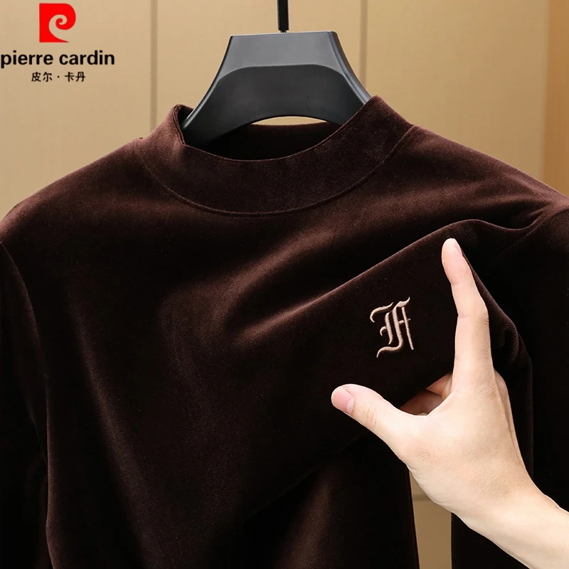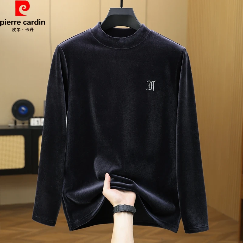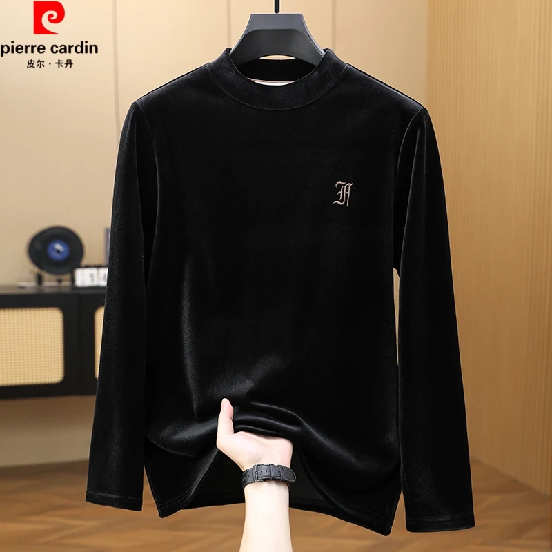 皮尔卡丹男士半高领秋冬金丝绒加绒卫衣长袖T恤新款刺绣上衣打底