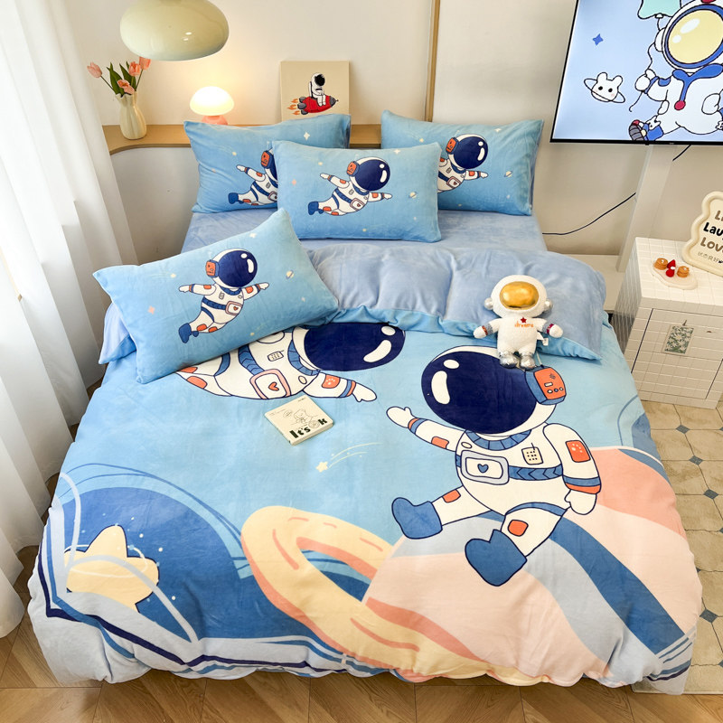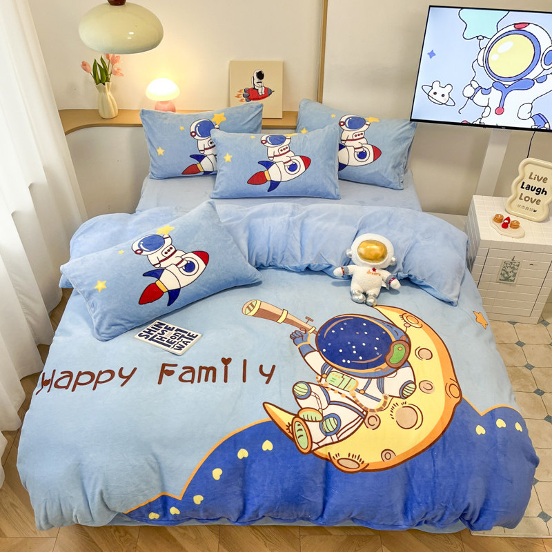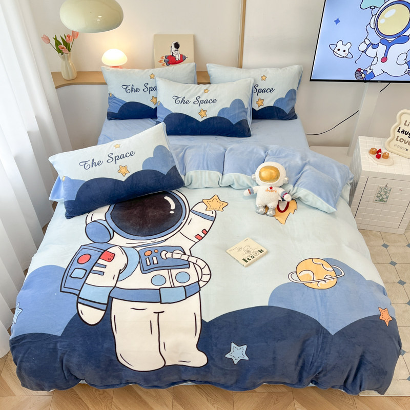 男孩加厚牛奶绒被套宇航员四件套