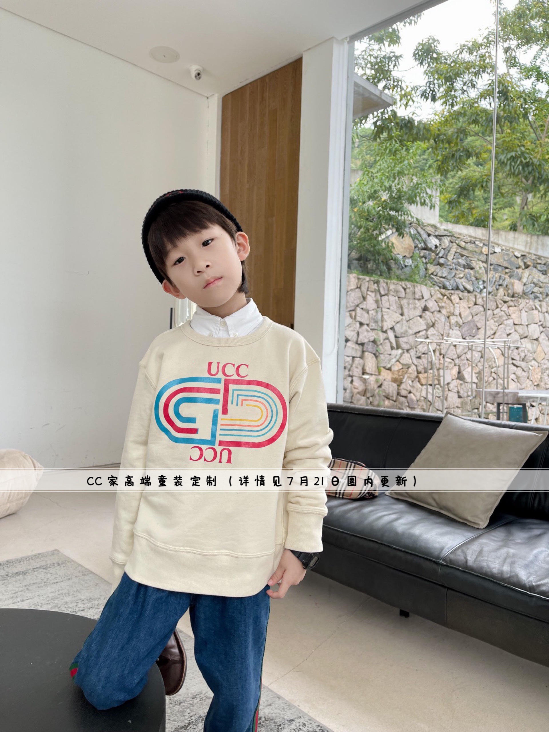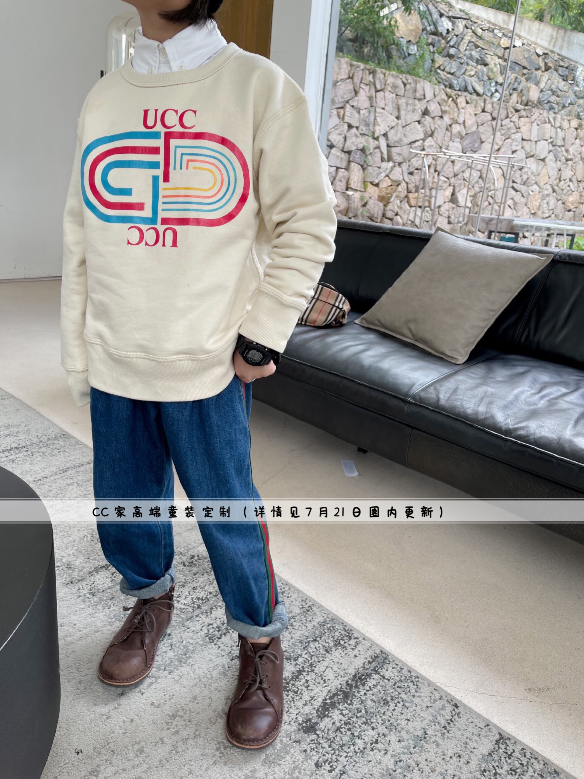 男女童亲子秋冬新款儿童圆领回形针纯棉加绒卫衣红绿条织带牛仔裤