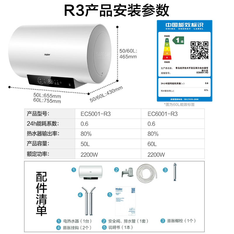 [换新补贴]海尔60L热水器电家用储水式卫生间洗澡官方50升统帅40L