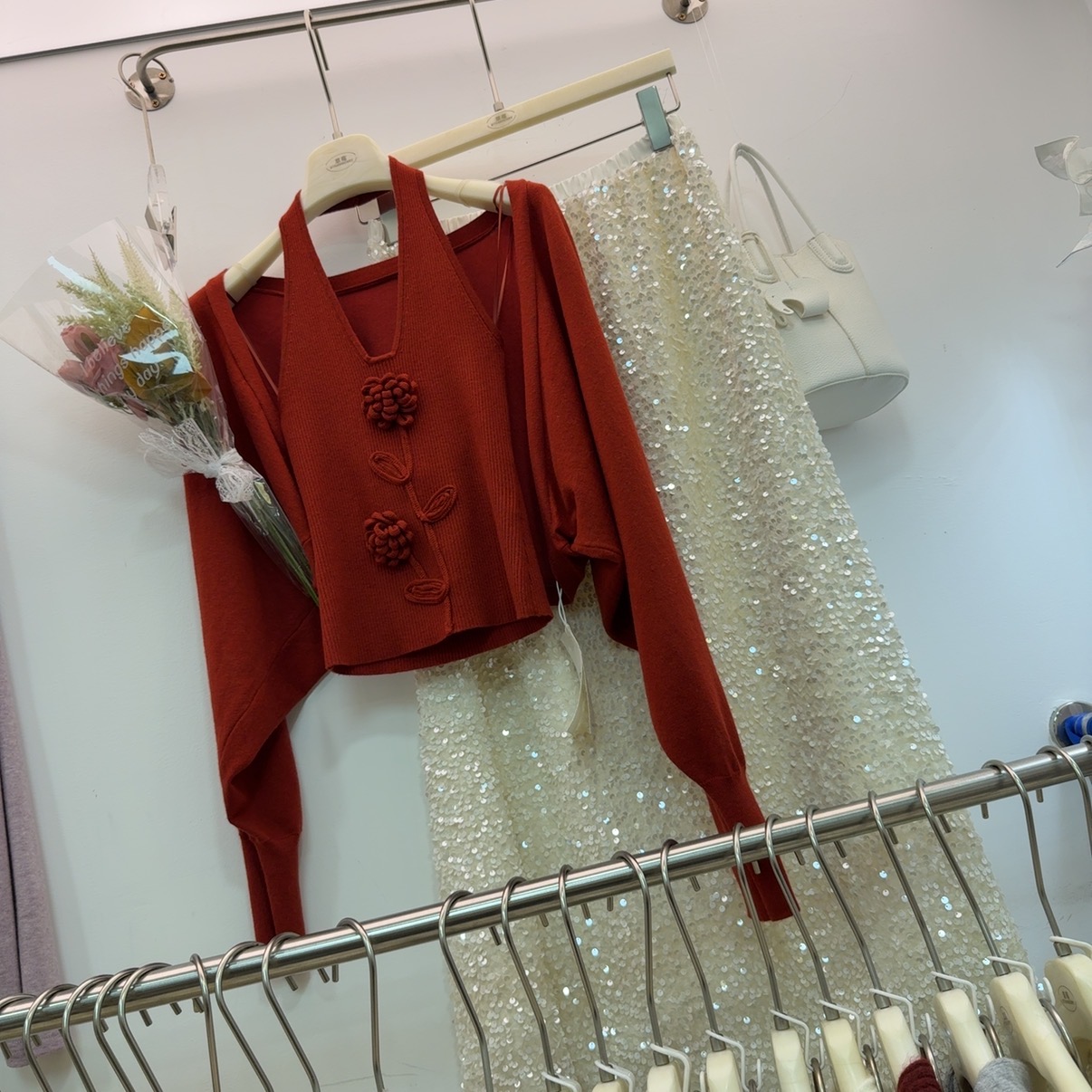 十三行现货2025秋新款韩版时尚挂脖针织背心开衫两件套S68392W178