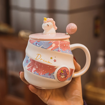独角兽陶瓷马克杯可爱女生礼物水杯带盖勺家用办公室早餐咖啡杯子
