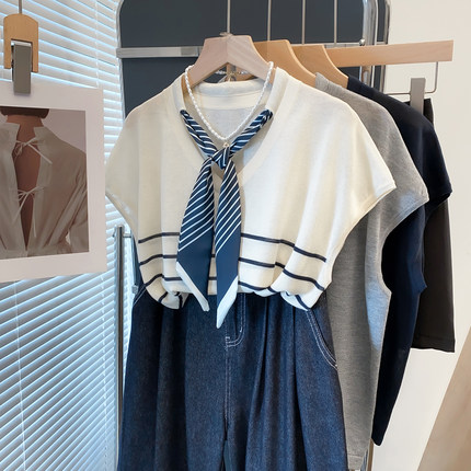 v领条纹落肩丝带针织衫女2025夏装新款宽松慵懒风上衣薄短袖t恤潮