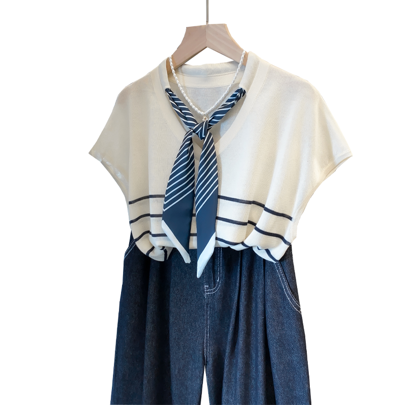 天丝亚麻v领条纹丝带针织衫薄T恤