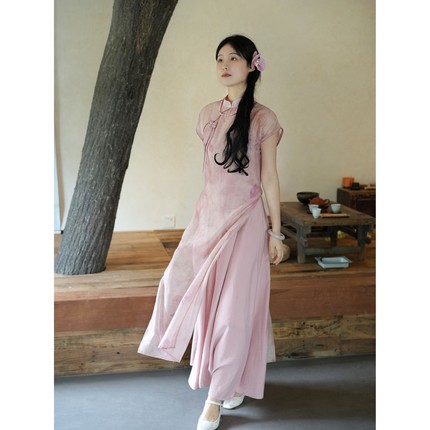 2025年夏季新款少女粉色薄纱草木染天丝改良旗袍+吊带裙
