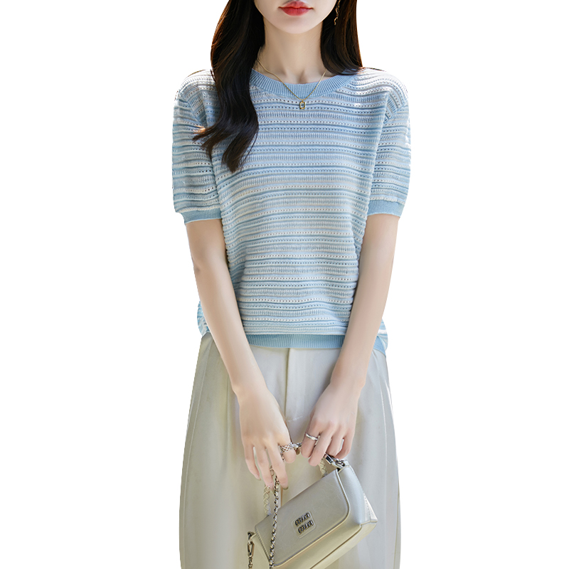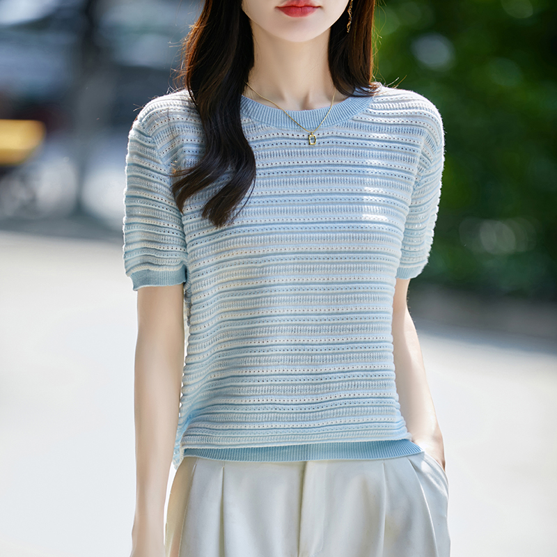 2025年夏季新款圆领条纹针织短袖女薄款外穿百搭T恤上衣宽松版型