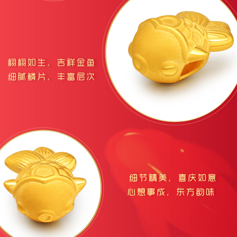 老庙黄金足金富贵金鱼锦鲤挂坠3D硬金磨砂光金心想事成情侣送礼物
