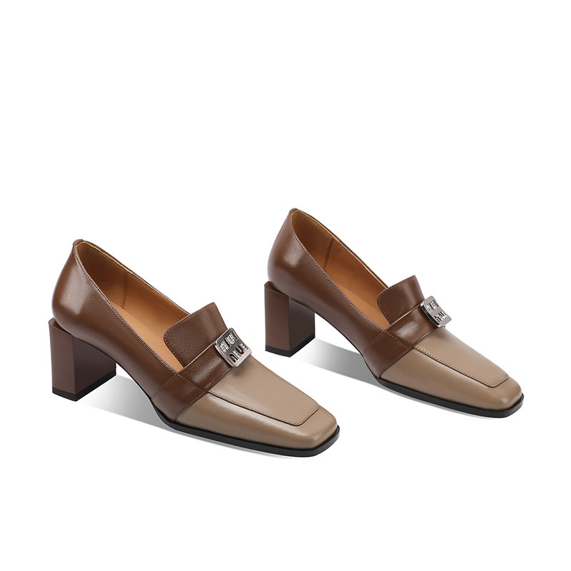 撞色拼接头层牛皮方头粗跟乐福鞋