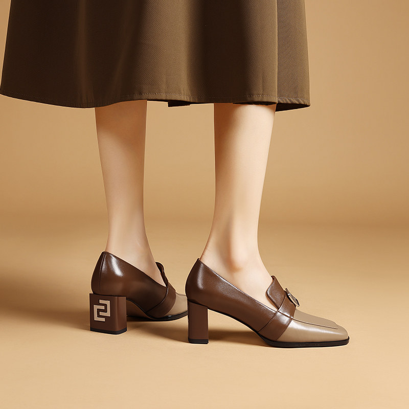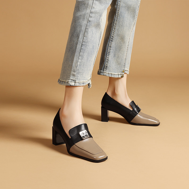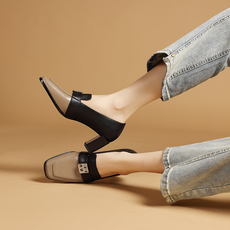 英伦风方头小皮鞋2025春季新款时尚拼色真皮粗跟中跟单鞋女乐福鞋