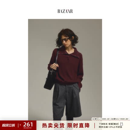 红色毛衣女秋冬复古简约绵羊毛宽松休闲打底套头翻领羊毛针织衫女