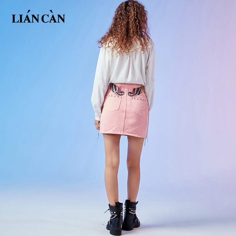 莲灿裂帛春季新商场同款甜美浪漫日常百搭绑带粉色牛仔半身短裙