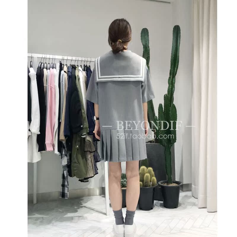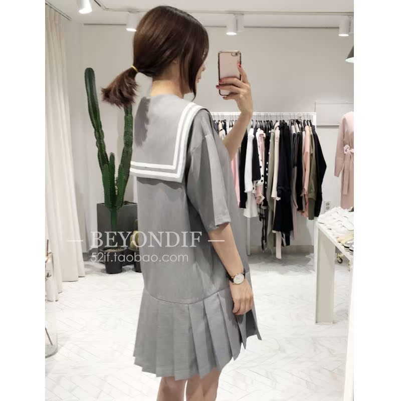 B家独家定制款海军领条纹宽松连衣裙短裙 五分袖灰色韩版百褶裙女