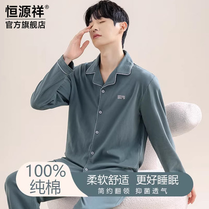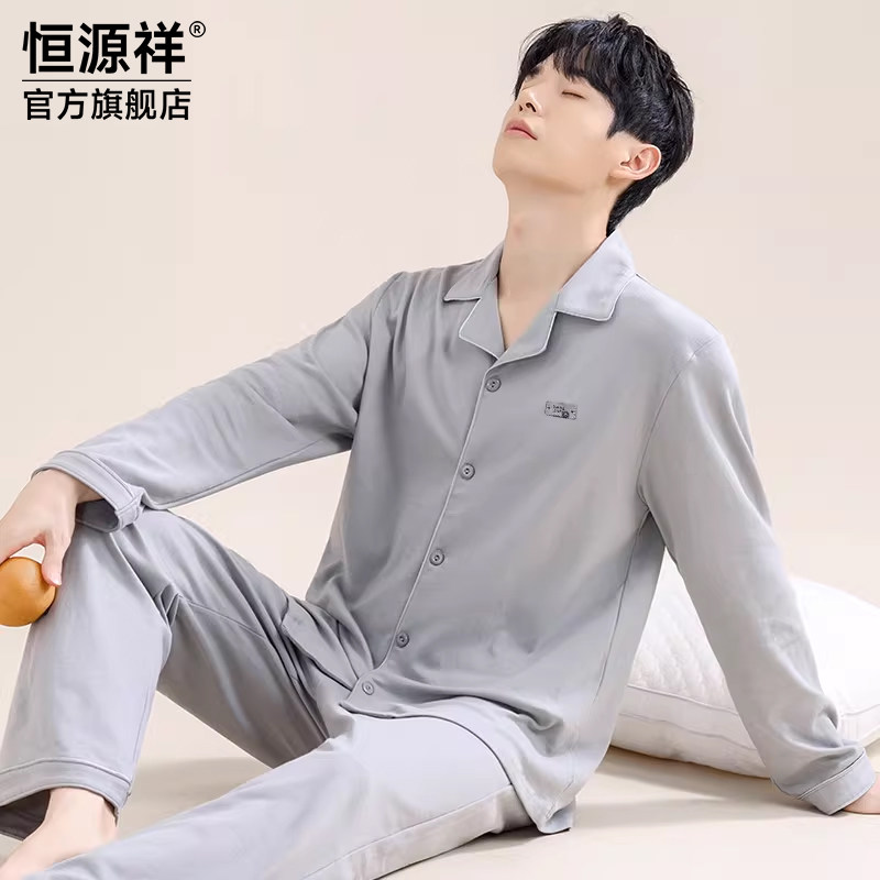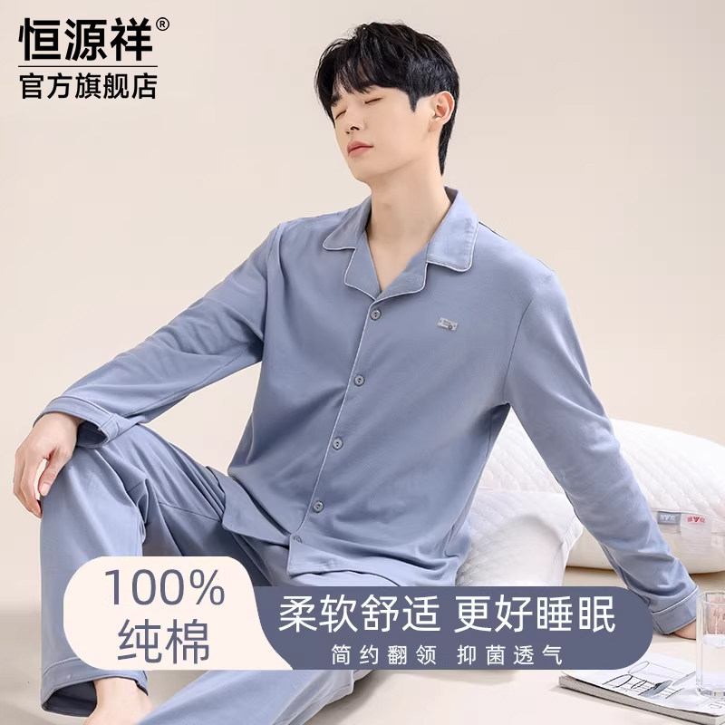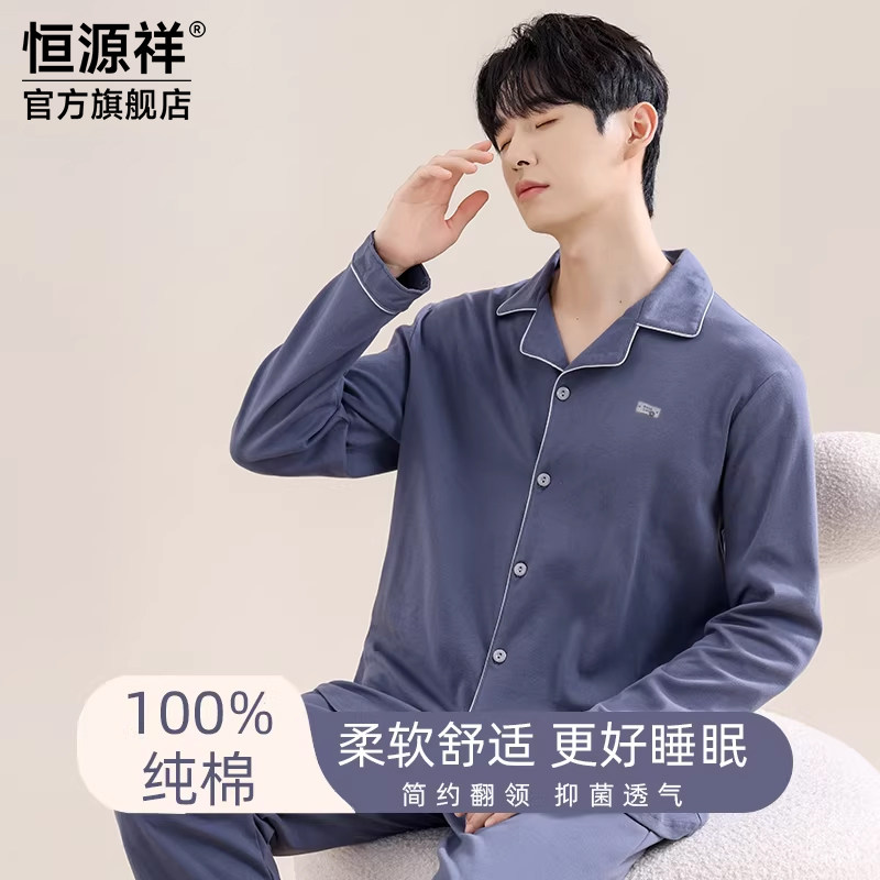 恒源祥男士纯棉睡衣春秋薄款长袖青少年男生全棉7A抗菌防螨家居服