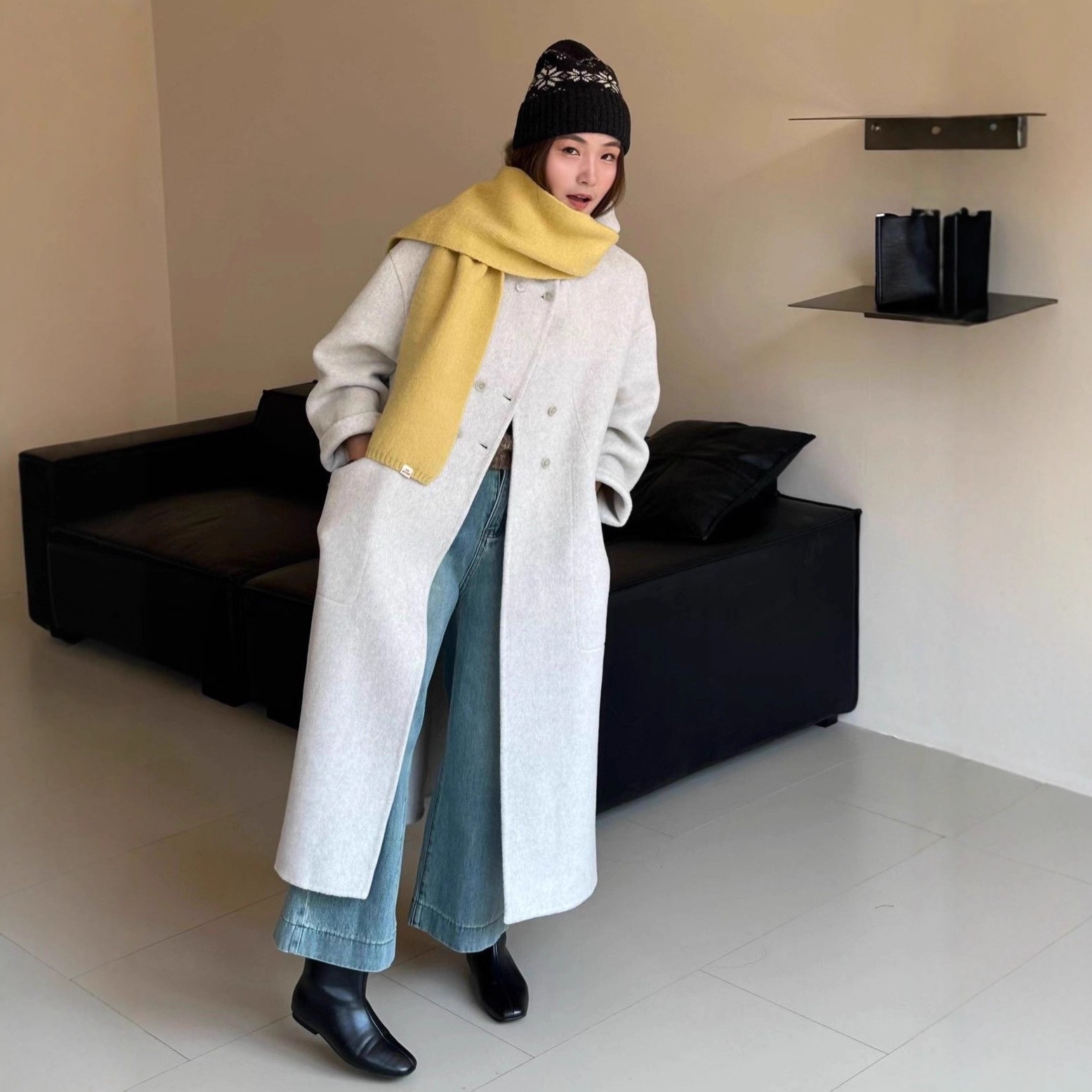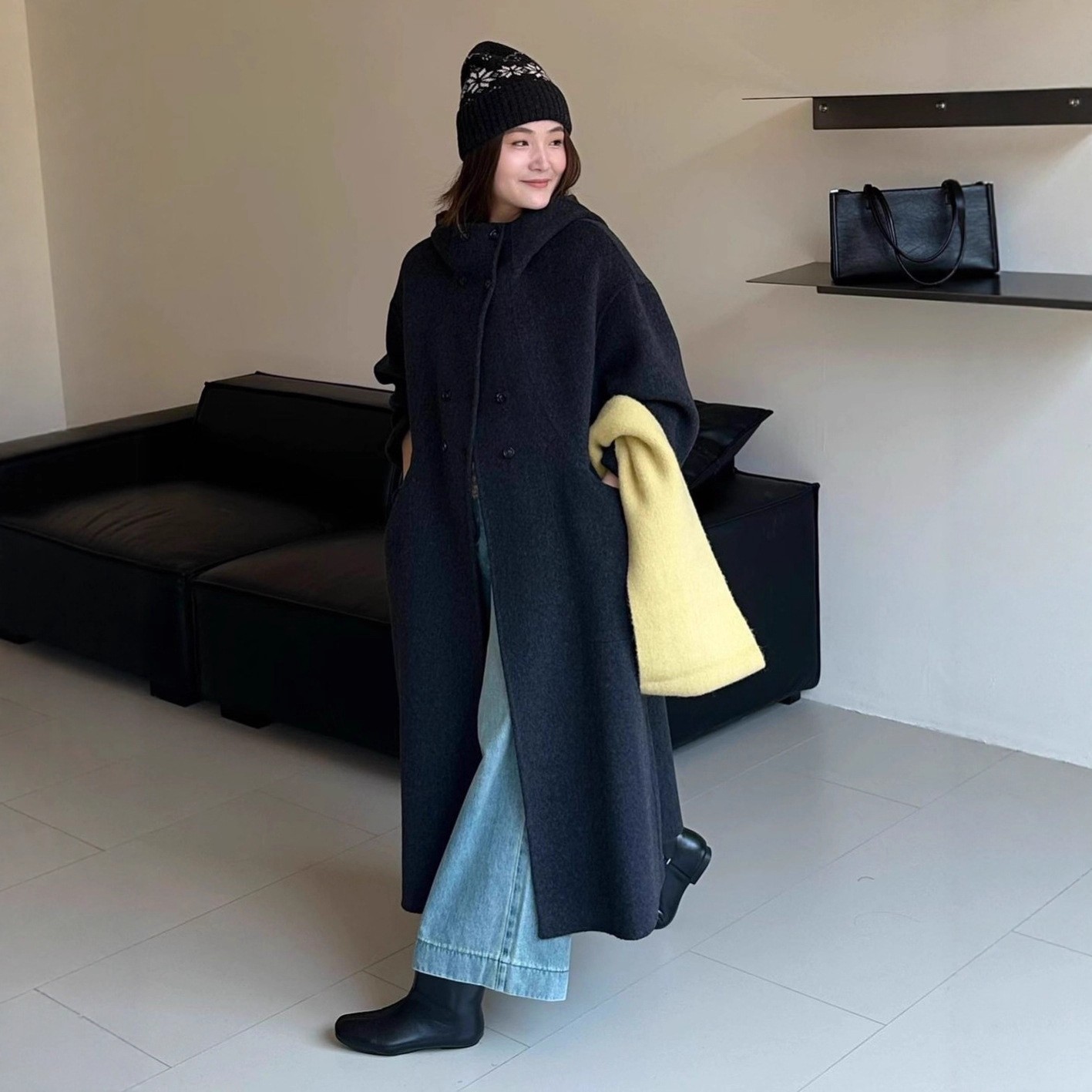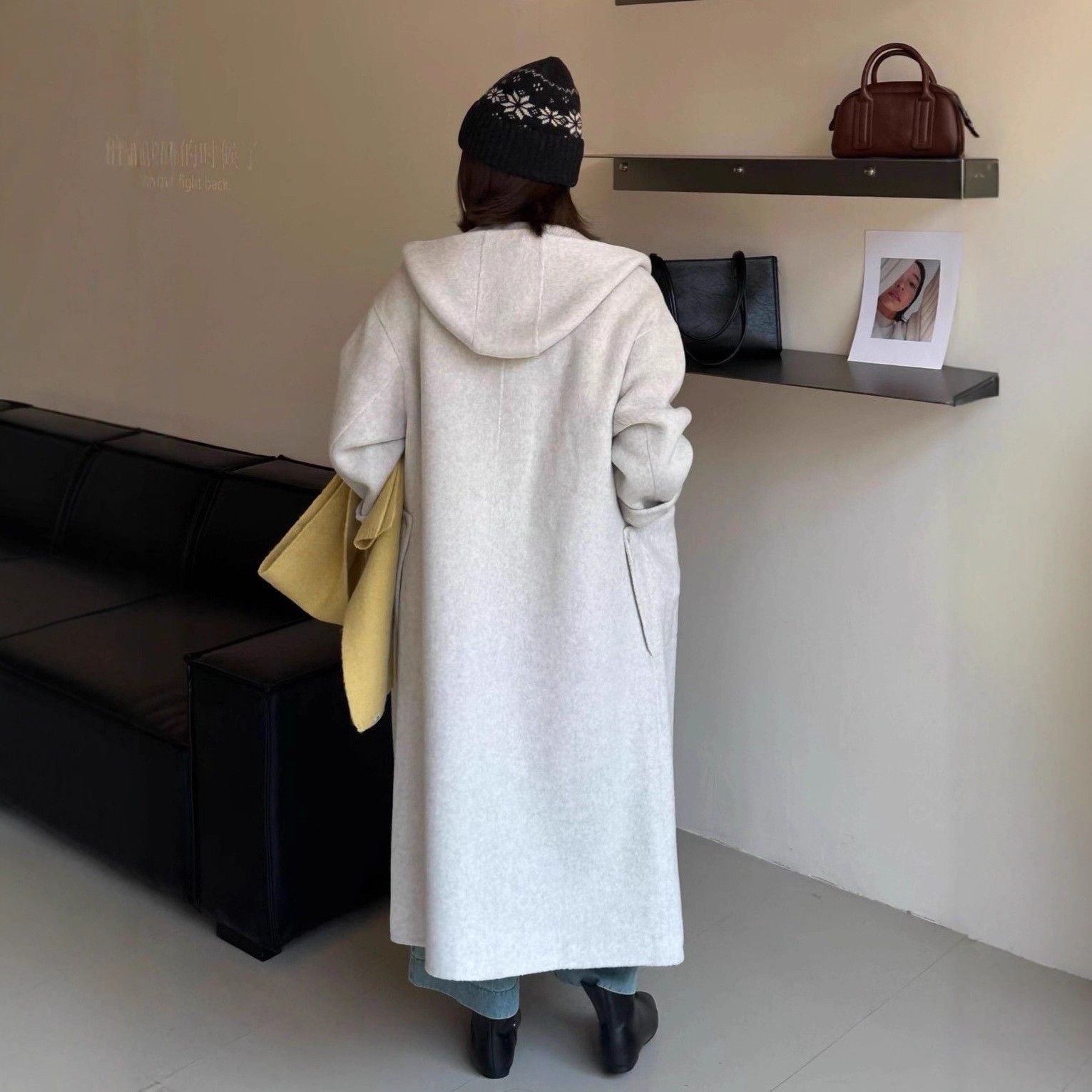 连帽双排扣立领双面羊毛大衣女长款宽松加厚过膝羊绒毛呢外套秋冬