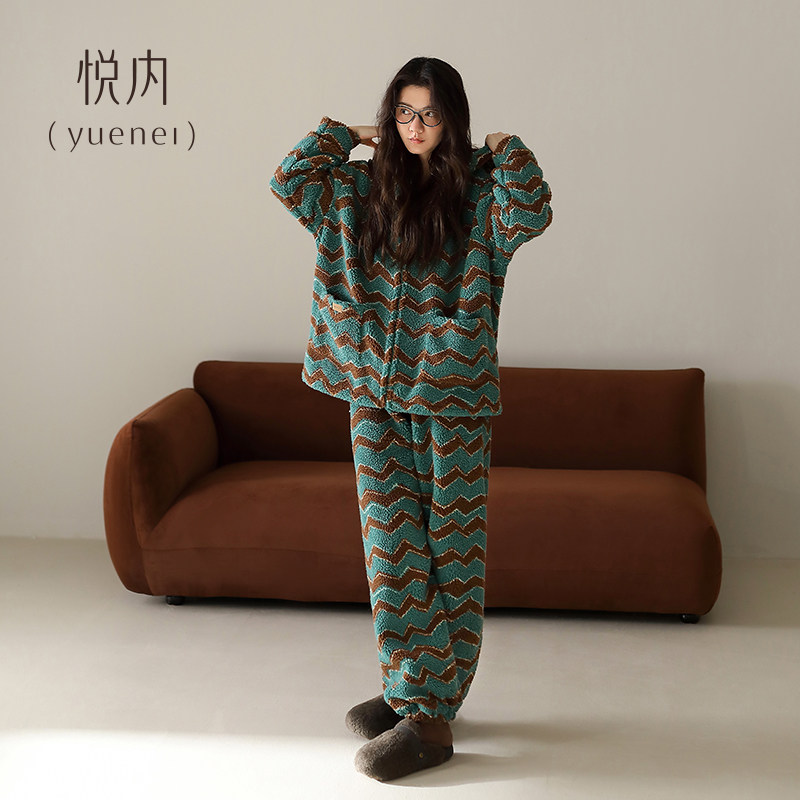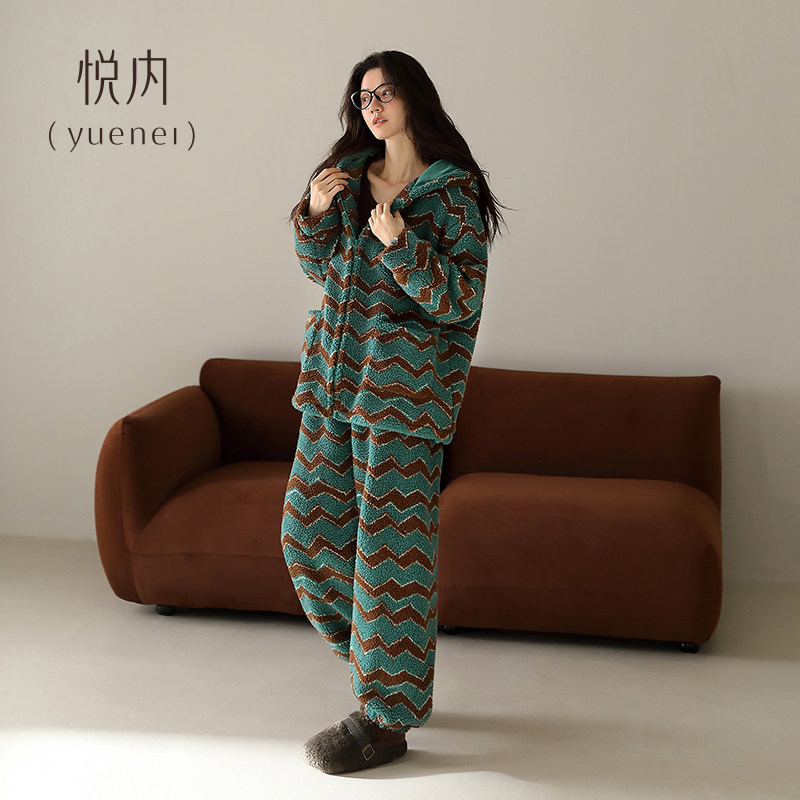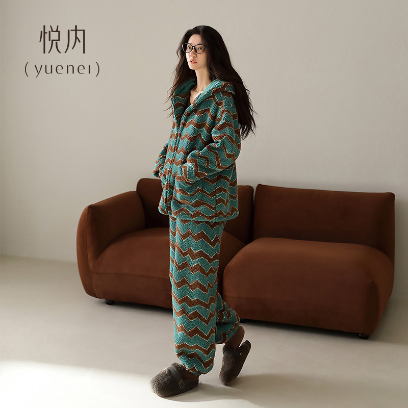 悦内睡衣女款秋冬季法兰绒加厚珊瑚绒加绒家居服保暖冬天款可外穿