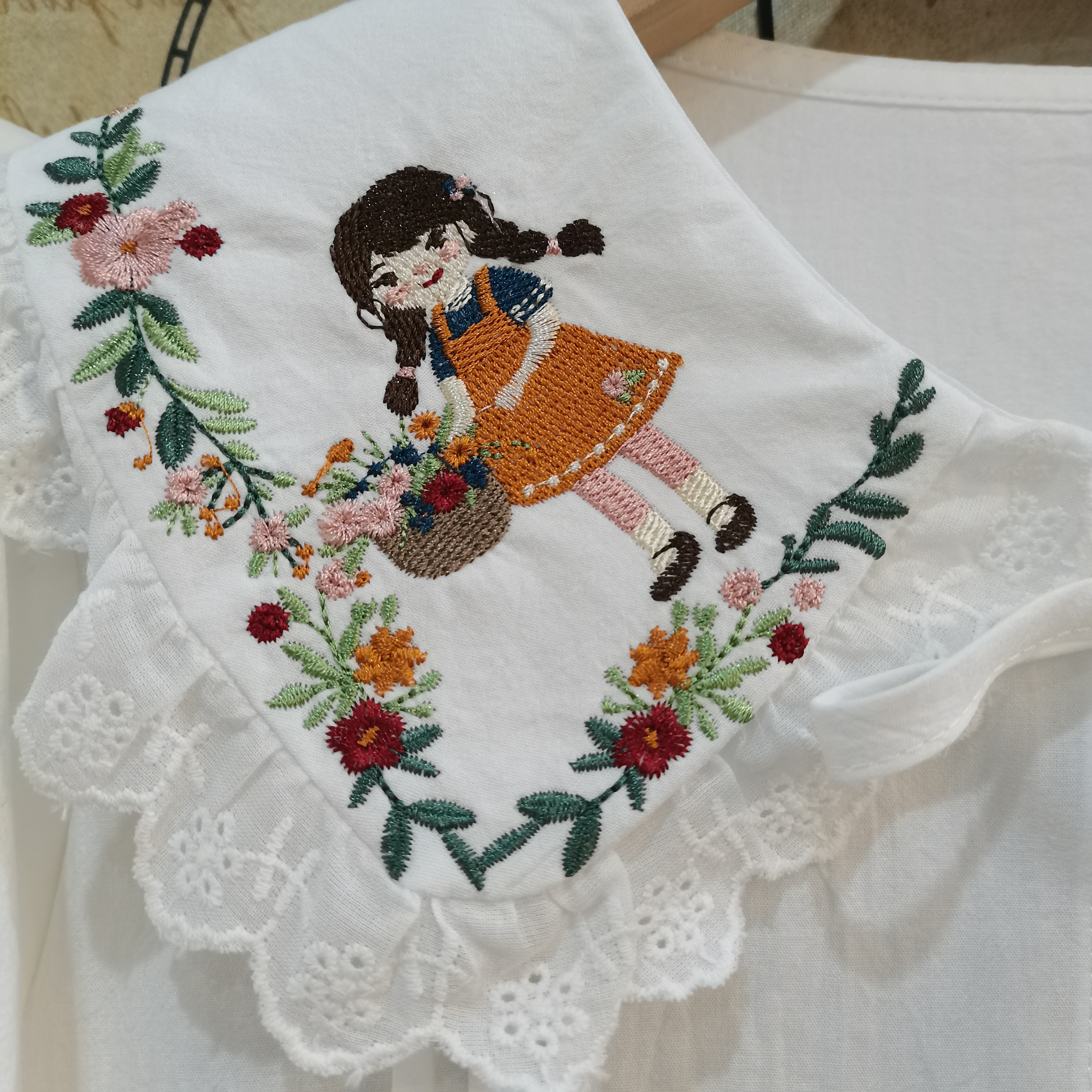 复古杏色卡通刺绣蕾丝拼接娃娃领衬衫女秋季新款气质休闲宽松上衣