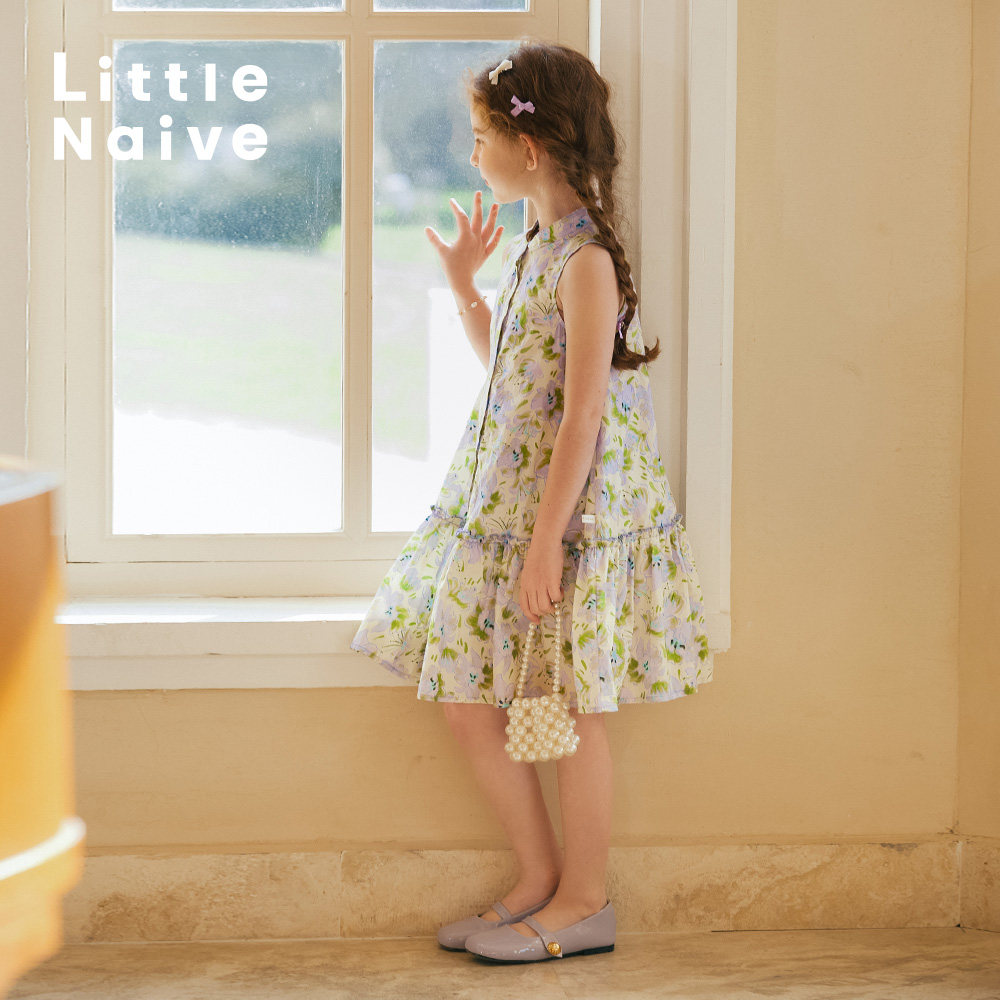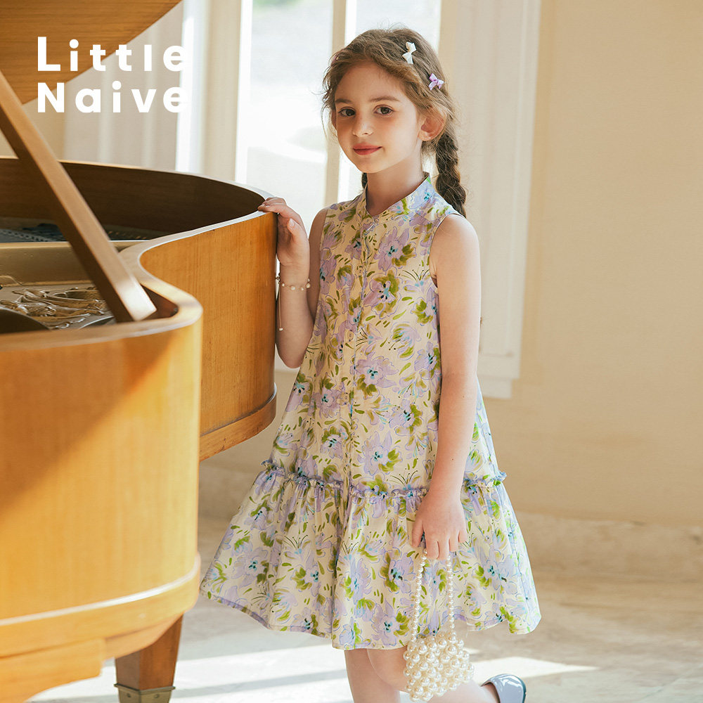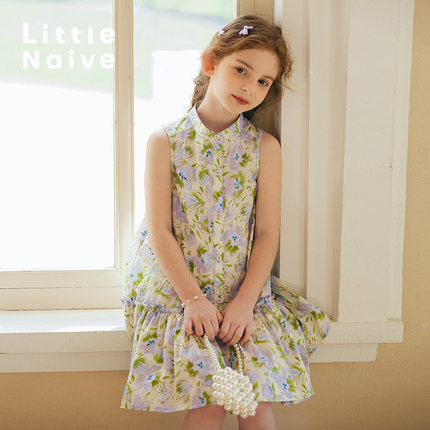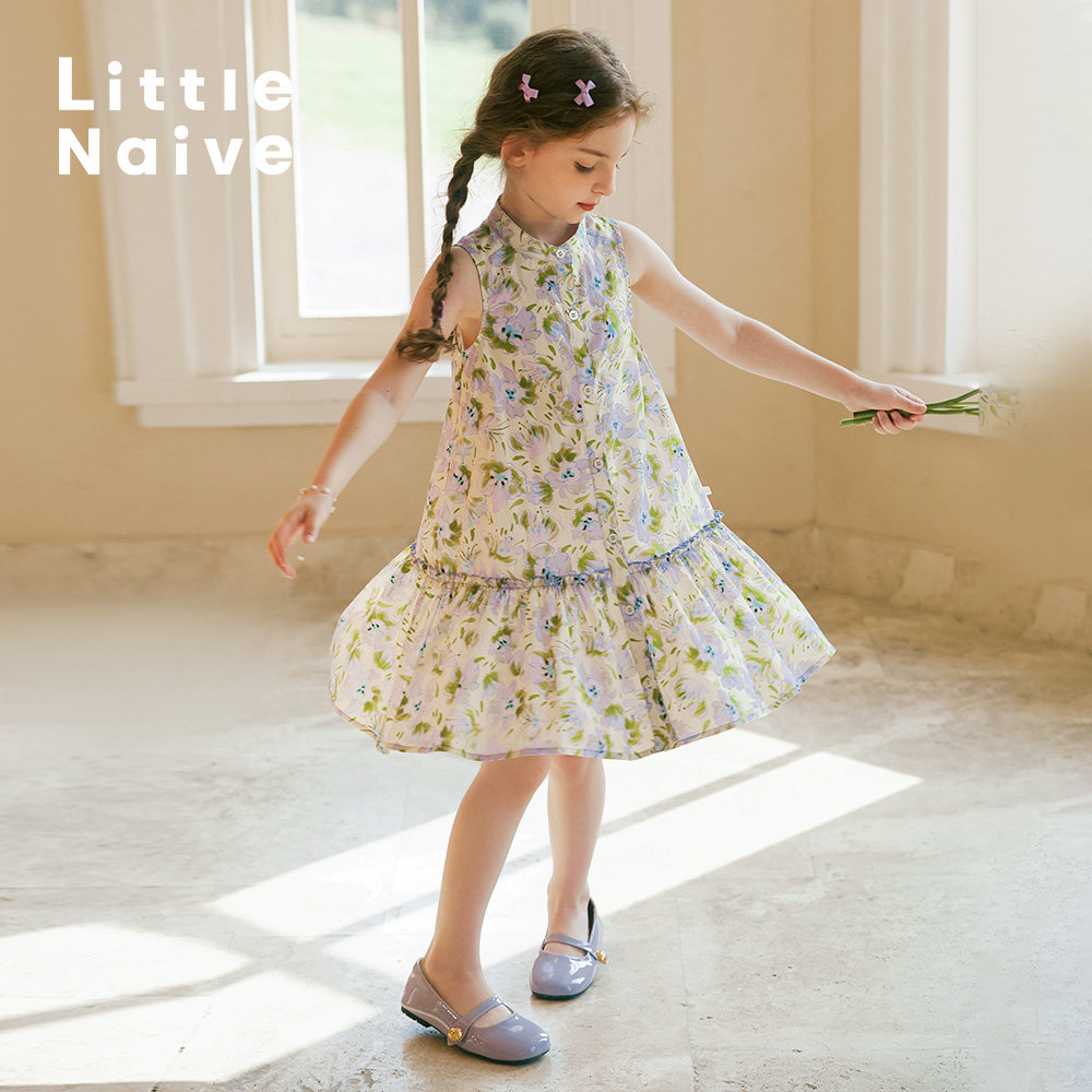 LittleNaive女童连衣裙夏季纯棉无袖甜美法式裙子儿童立领碎花裙