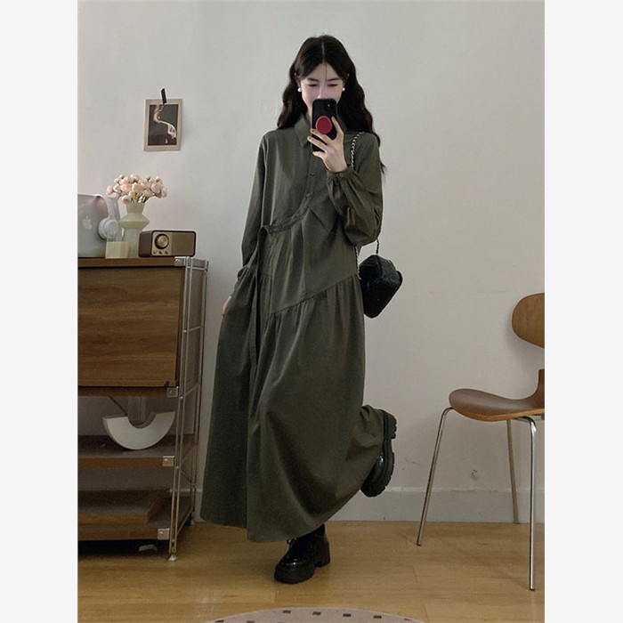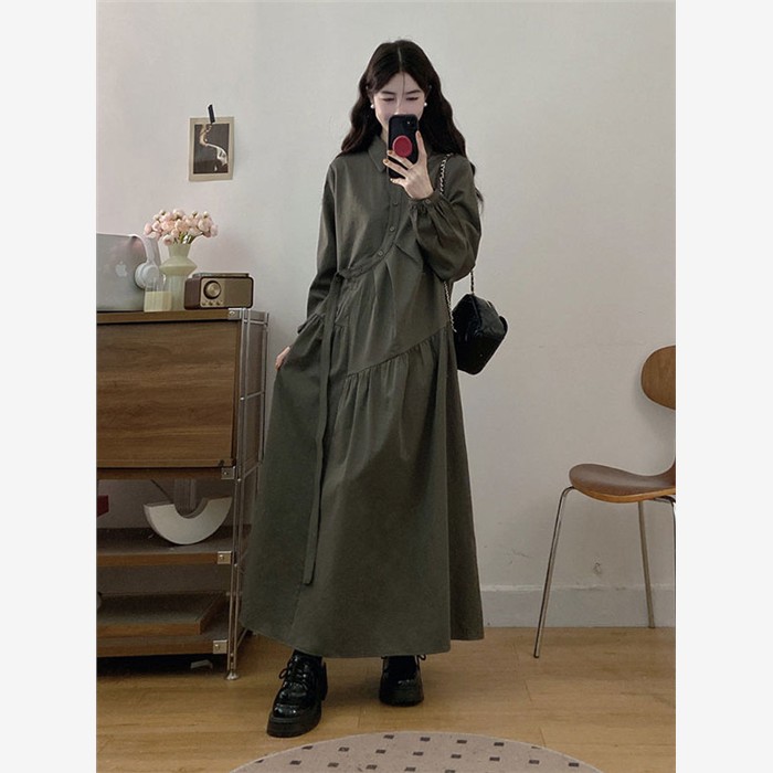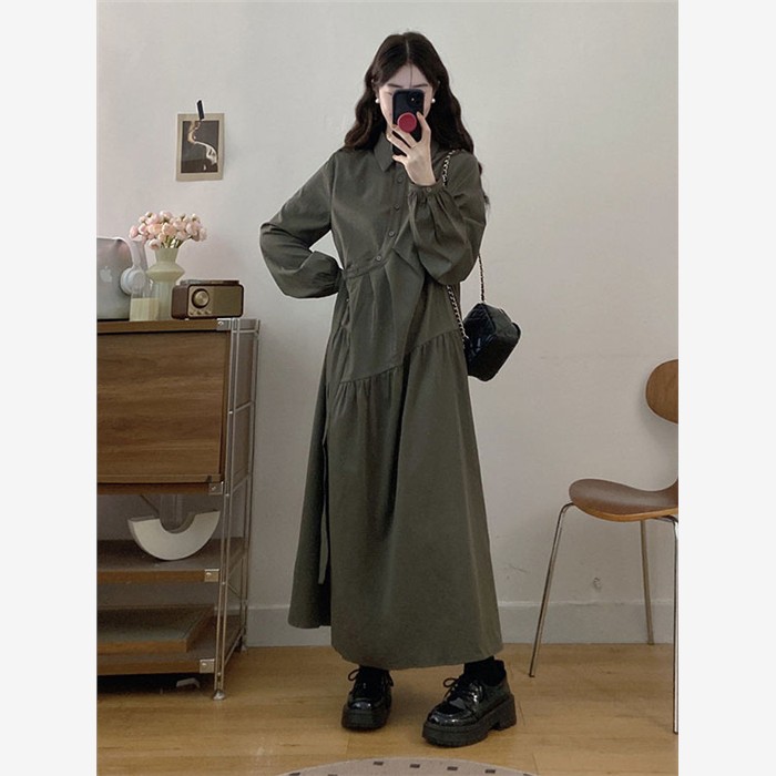 大码法式设计感长袖衬衫连衣裙女秋冬季高级感不规则显瘦收腰长裙