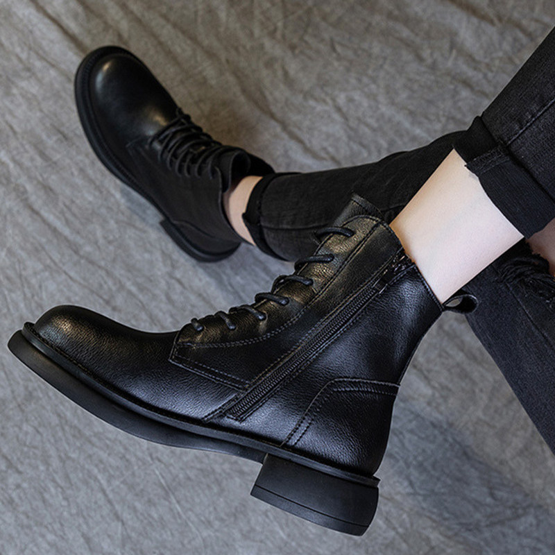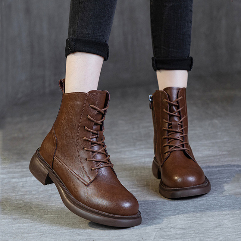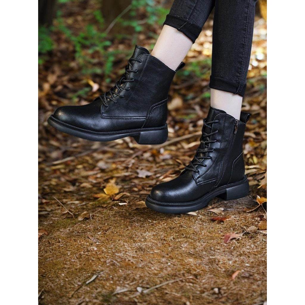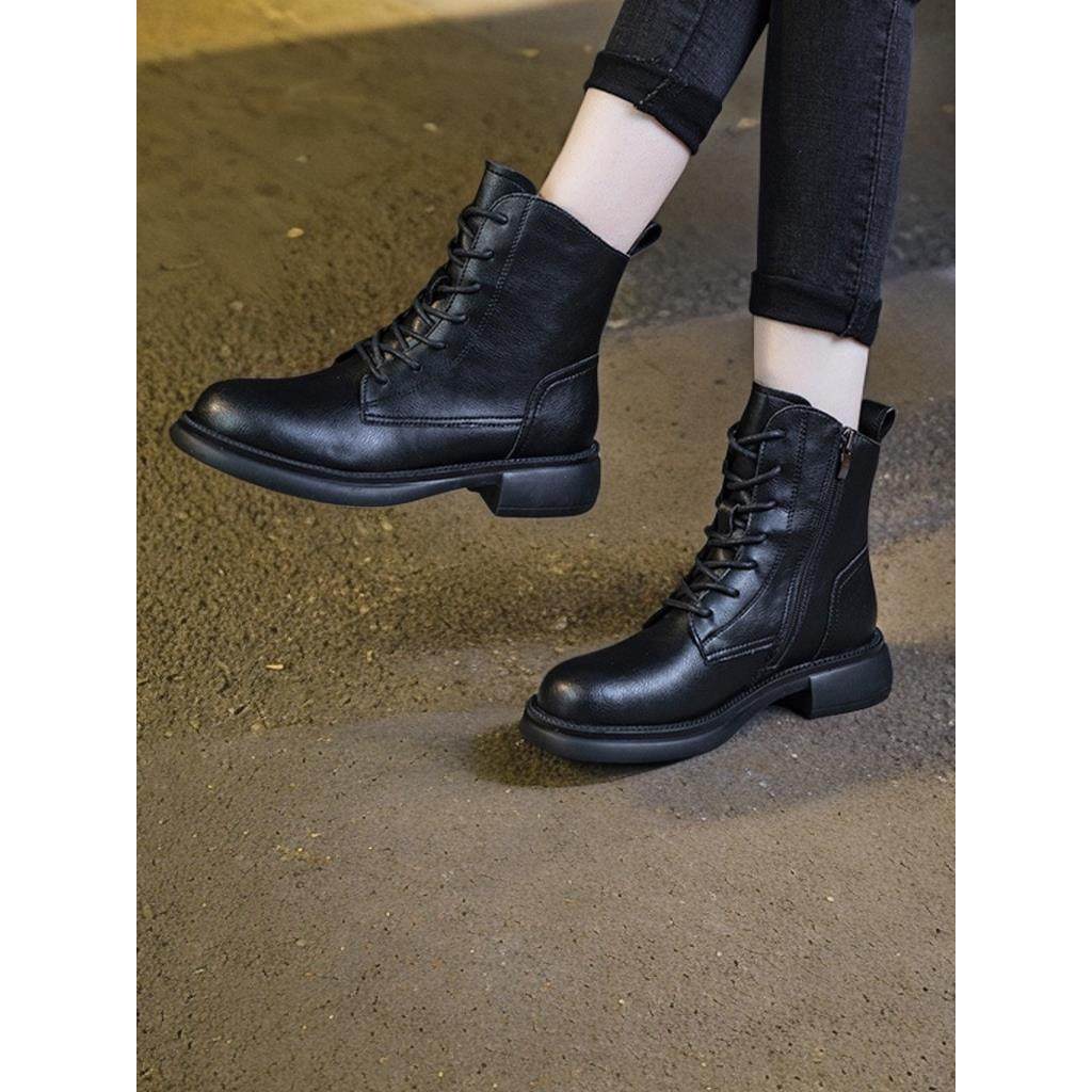 4CM女靴加绒女士皮靴百搭高端英伦风厚底秋冬款低筒粗跟马丁靴女.