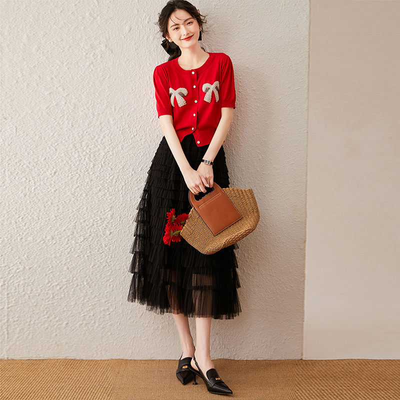 白鹿语气质蝴蝶结钉珠开衫夏款时尚圆领泡泡短袖女式针织衫