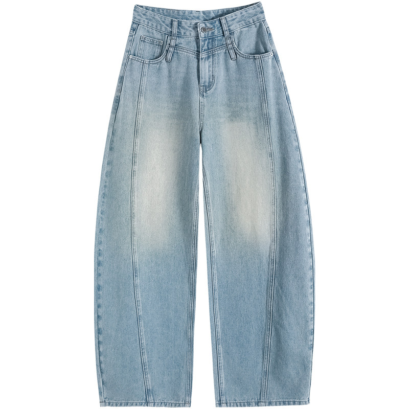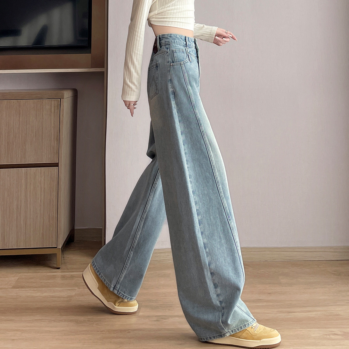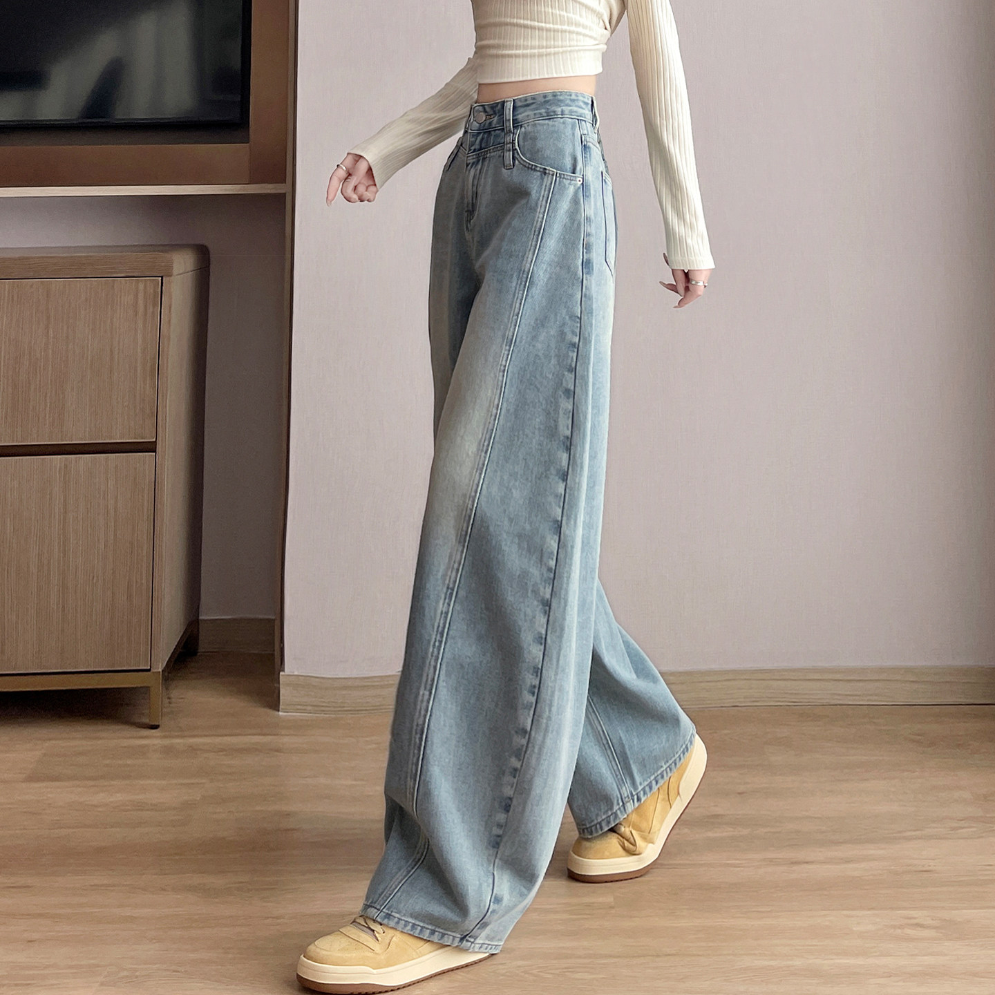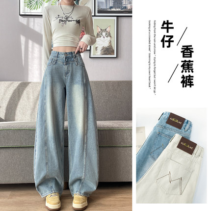 浅蓝色阔腿牛仔裤女高腰春秋2026新款宽松直筒显瘦垂感拖地弯刀裤