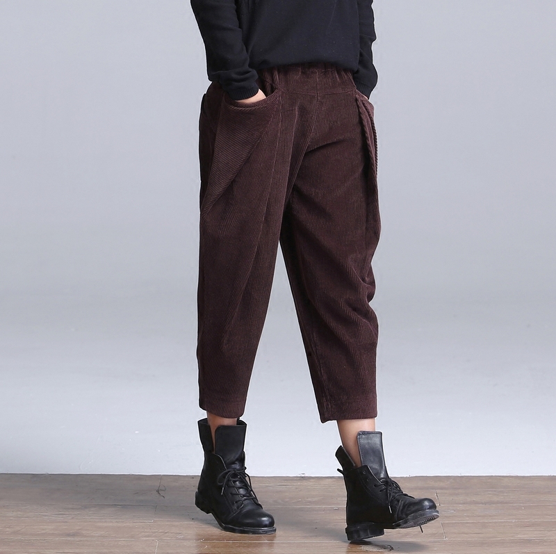大码女裤休闲文艺女裤 冬季纯棉高腰粗条绒哈伦裤 锥型裤七分靴裤