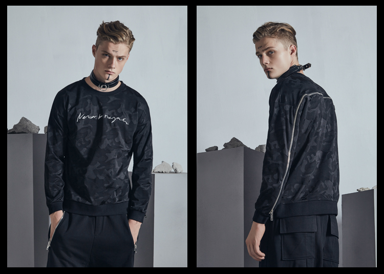 原创潮牌男装 欧美个性暗纹迷彩后背弧形拉链拼接长袖卫衣男潮