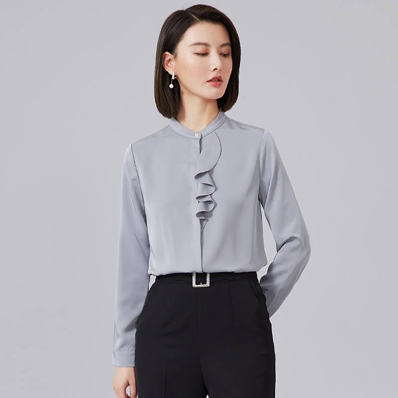 璐丝百丽灰蓝色立领雪纺衬衫女长袖荷叶边衬衣春洋气时尚职业上衣