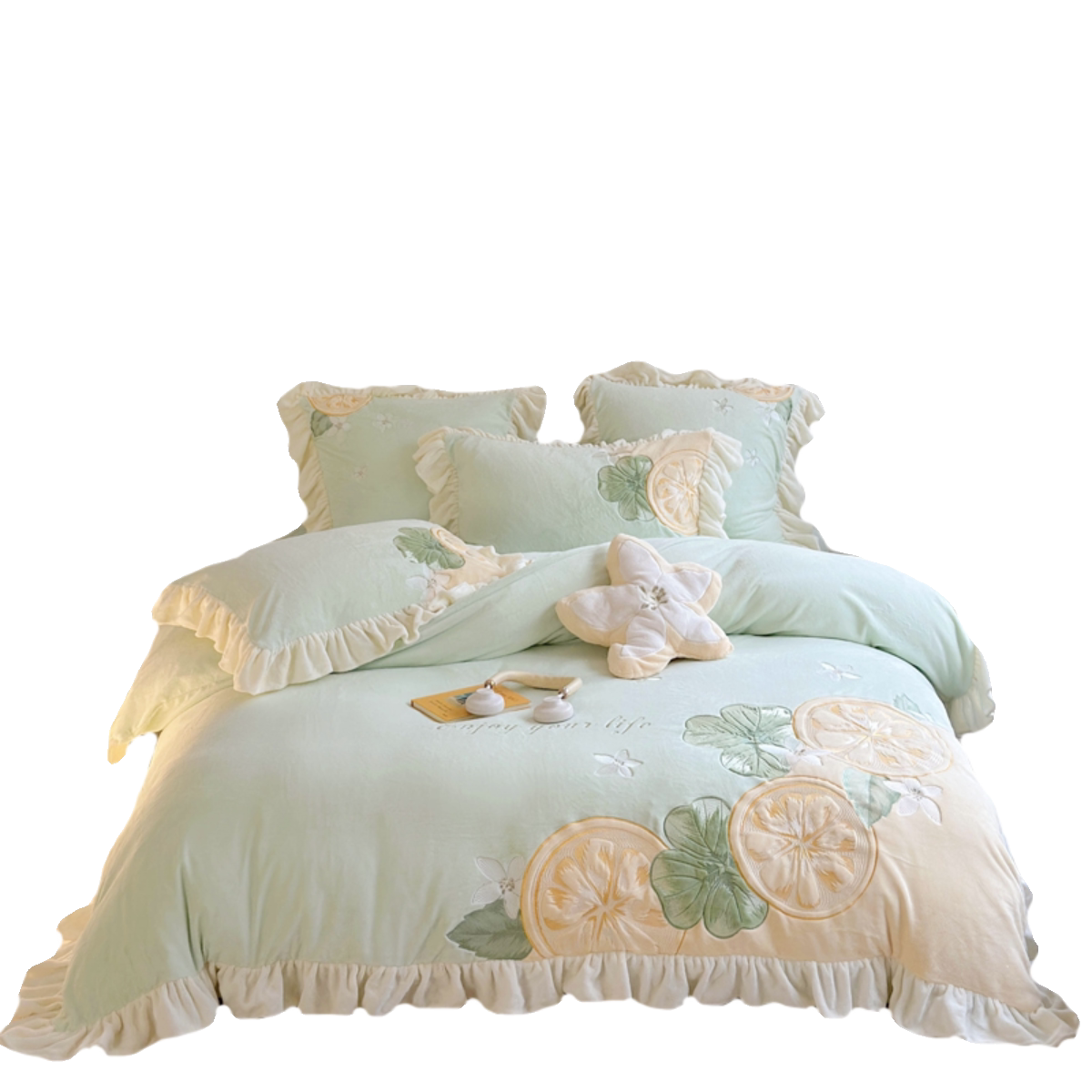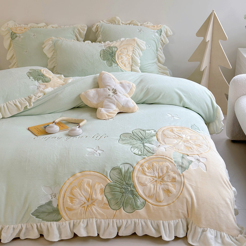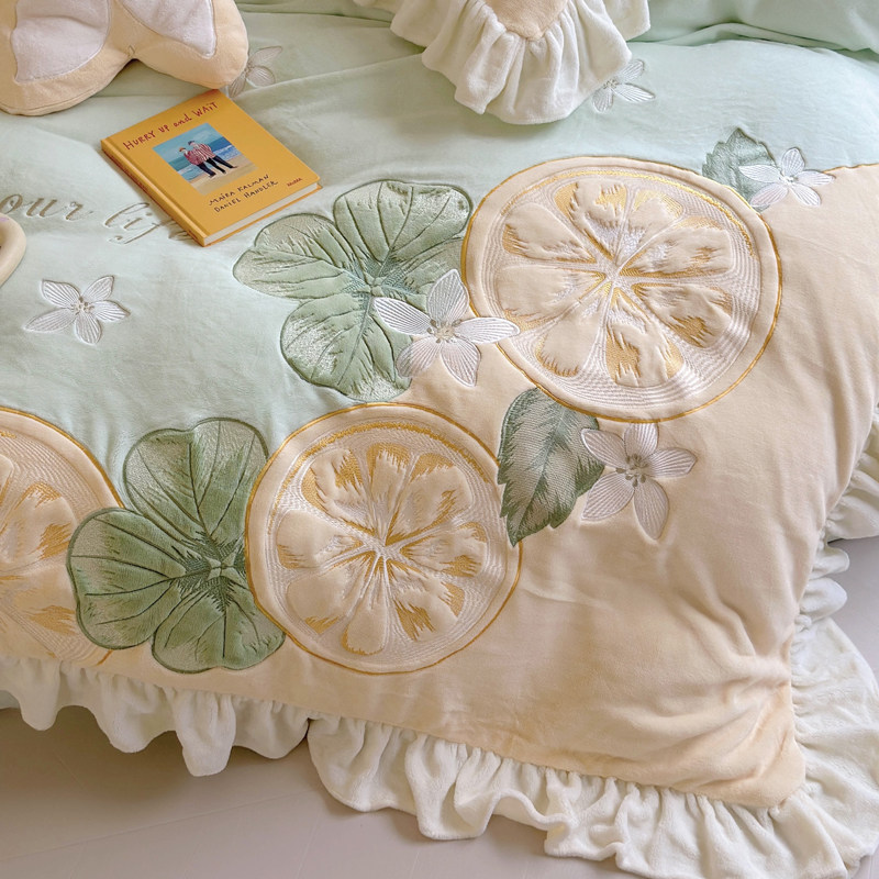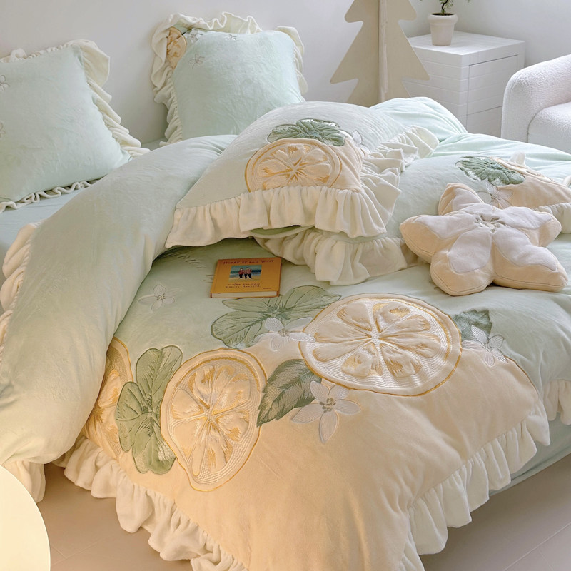 ins冬季柠檬加厚牛奶绒床上四件套公主风双面毛绒被套珊瑚绒床单4