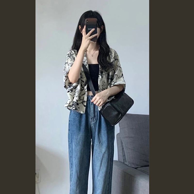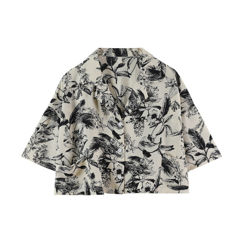 休闲短袖花衬衫女短款夏季小众设计感独特港风复古小个子上衣潮