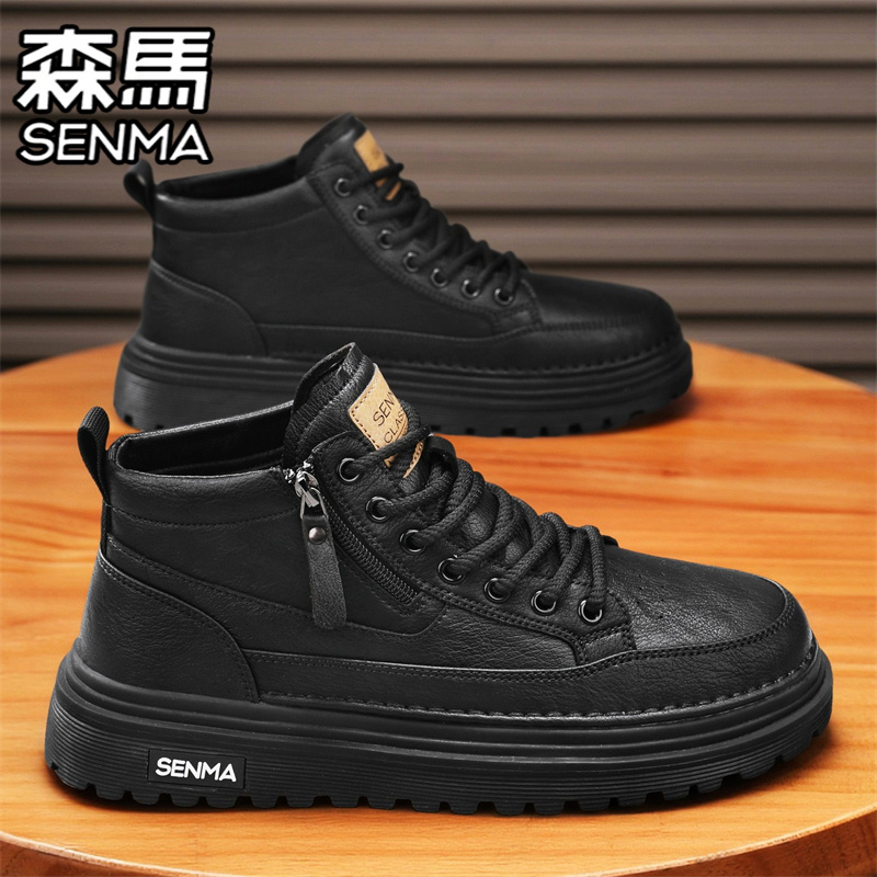 森马马丁靴男秋季高帮板鞋男士休闲皮鞋真皮黑色男鞋工装马丁靴子