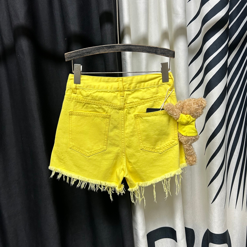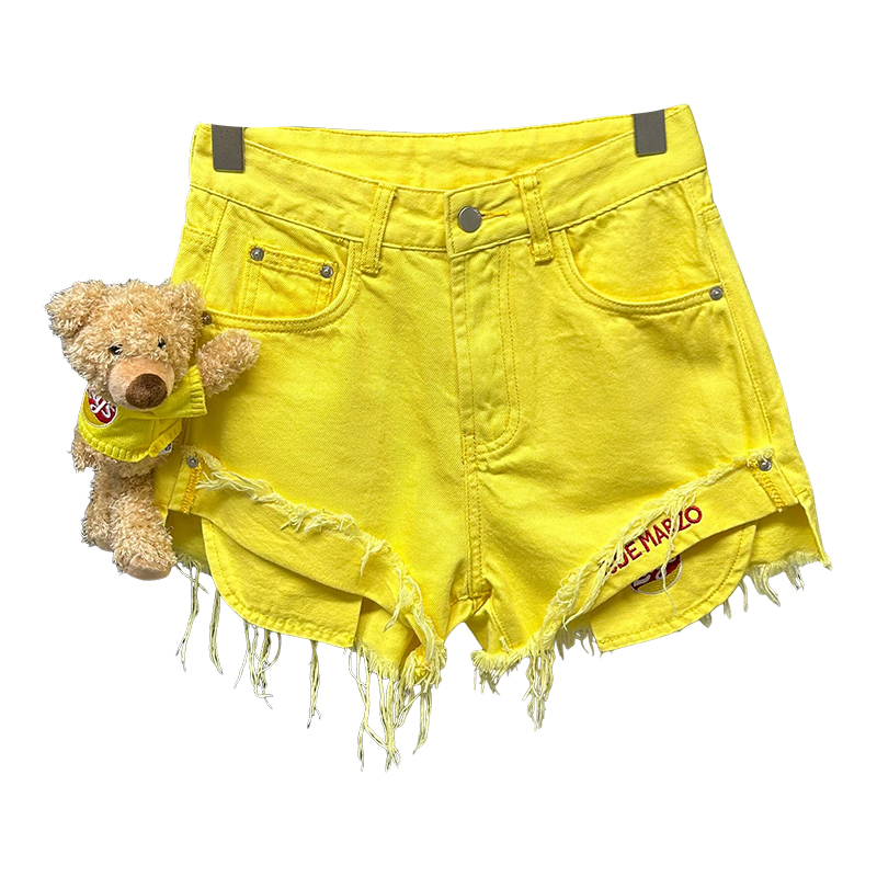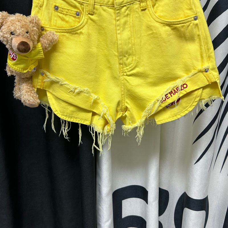 黄色高腰显瘦夏季毛边牛仔短热裤