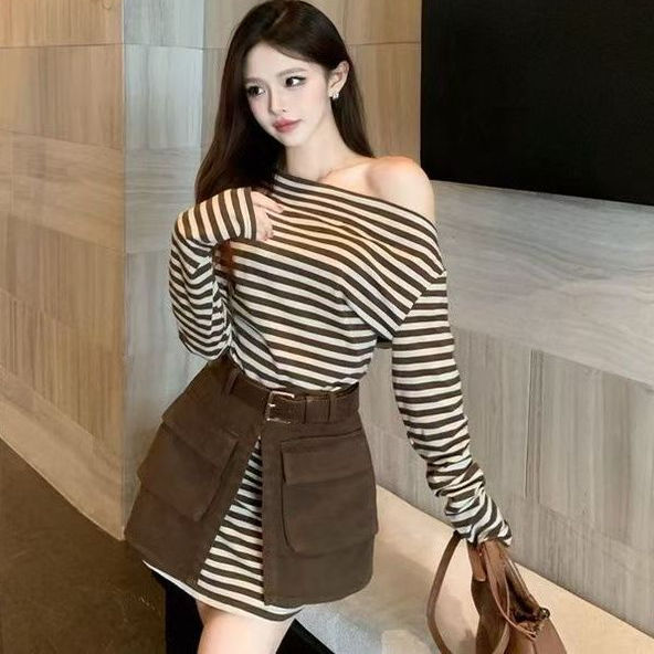 欧货时尚高级感露肩条纹连衣裙女2025秋季设计感显瘦腰封上衣套装