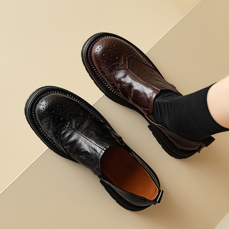 高定版软羊皮厚底加绒乐福鞋女秋冬新款英伦圆头复古雕花小皮鞋